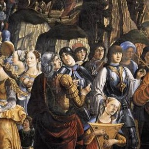 | Zugeordnete Bildprotagonisten: | in einer Gruppe zeitgenössischer Porträtfiguren der linken Bildhälfte; einer von vier Männern in Rüstung, überschnitten von diesen Männern; jüngere Männer in Rüstung sowie Jüngling mit roter Kappe hinter der hier diskutierten Figur von Steinmann vorgeschlagen als jüngere Mitglieder der Familie Orsini; Rückenfigur in Rüstung von Steinmann vorgeschlagen als Roberto Malatesta; Bartoli zufolge könnten in dieser Personengruppe Mitglieder der Familie Rovere oder des papsttreuen römischen Adels gesehen werden |