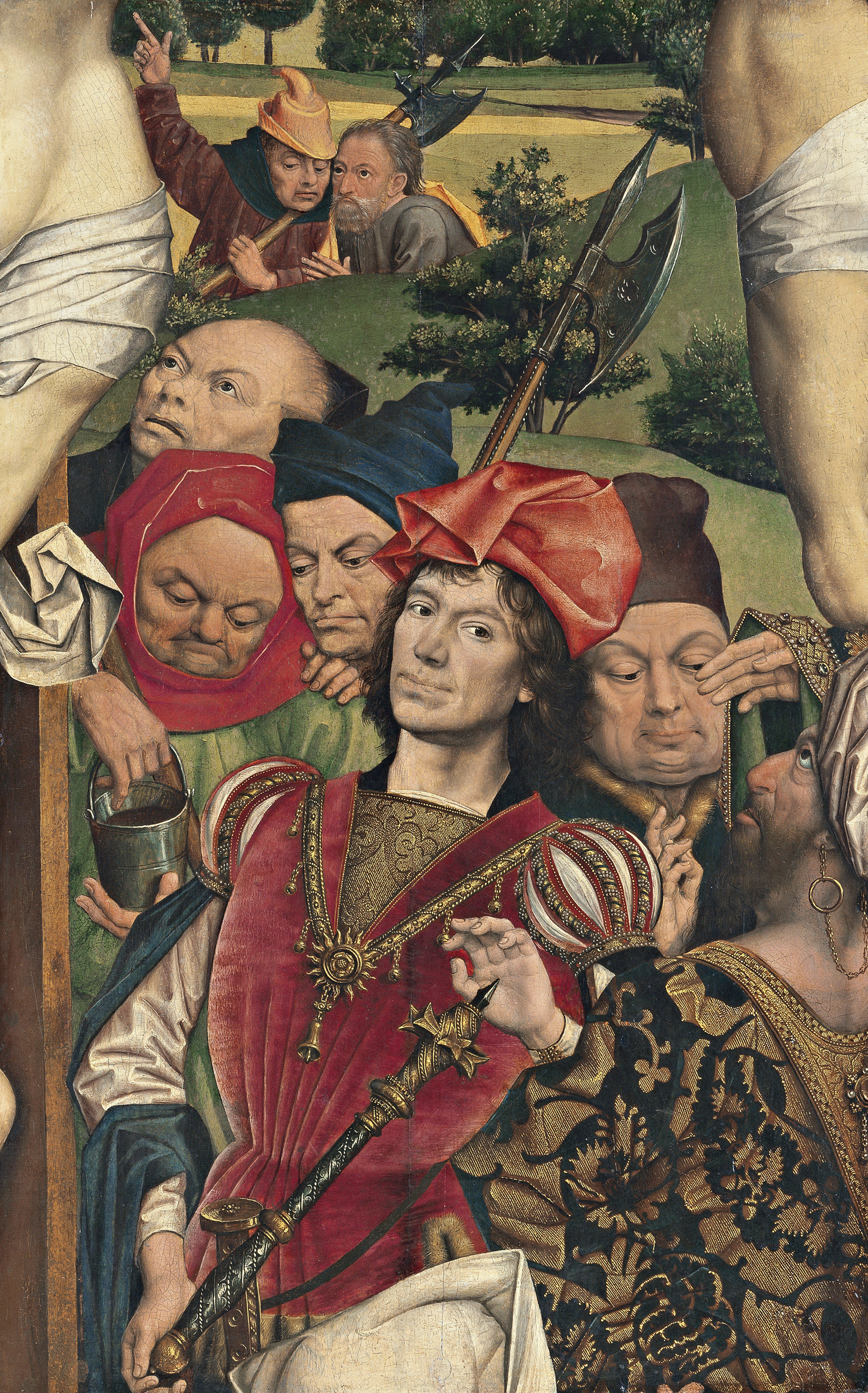 Die Selbstdarstellung des Malers ist weitgehend anerkannt, was wegen der starken physiognomischen Übereinstimmungen des Bildnisses mit dem in der Dortmunder Kreuzigung gerechtfertigt ist. Neben der allgemeinen Erscheinung ist auch die Gestaltung des Porträts als Dreiviertelporträt mit Drehung nach links3 und die Position unter dem Kreuz ähnlich. Gerade letzteres ist jedoch kritisch zu hinterfragen. Einerseits gibt es in Kreuzigungsszenen kaum Porträts, die nicht in mehr oder weniger unmittelbaren Nähe der Kreuze verortet wären, andererseits unterscheiden sich sowohl die Position als auch der Status der Bildnisse erheblich. Während Baegert in Dortmund nämlich unter dem linken Kreuz, innerhalb der Veronikagruppe und ohne Einnahme einer Rolle auftritt, so ist er im Madrider Fragment unter dem zentralen Kreuz und in der ikonografisch belegten Rolle des guten Hauptmanns zu sehen.4 Lediglich Rinke kommt nach einer Analyse von Kleidung und Zepter des Mannes zum Schluss, dass sich Baegert als arroganter Malerfürst, der seinen Stand bewusst überschreitet, inszeniert habe.5