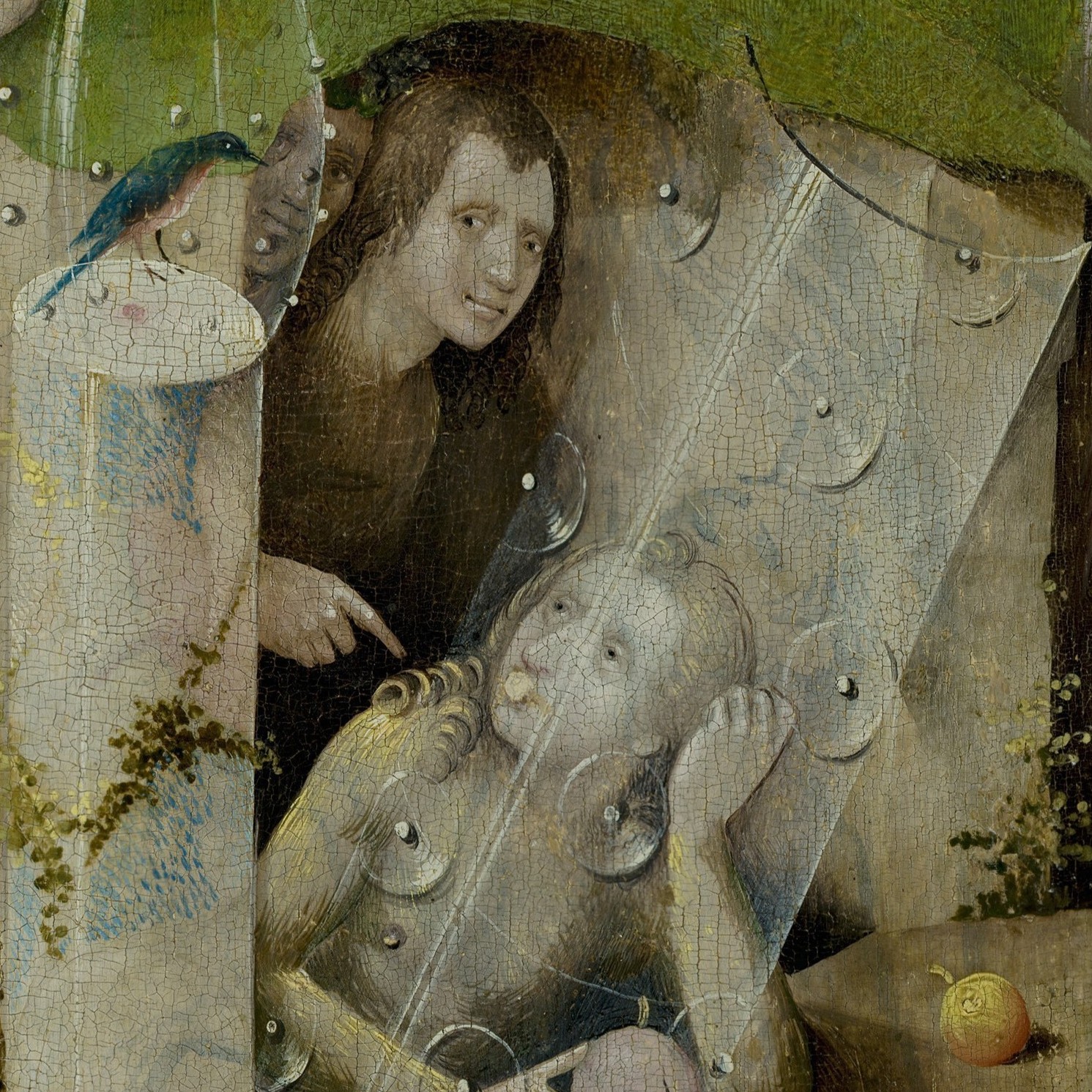 | Interaktion/Raum-, Bildraumbeziehung/ Alleinstellungsmerkmal: | innerhalb der Höhle im rechten Bildrand nur teilweise sichtbar; von gläsernen Körpern, einer Säule und der vorgelagerten Frau überschnitten; in Gesellschaft einer weiteren Figur dahinter; scheinbar in Kommunikation mit einem Vogel in einer Glasvase auf selber Höhe weiter links |