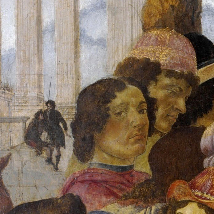 Am eindeutigsten und ausführlichsten gegen ein Selbstbildnis spricht sich Bode (1921, 1926) aus, der so weit geht zu schreiben, „[d]er schöne Jüngling […] kann unmöglich Botticelli sein“9. Für ein Selbstbildnis spreche lediglich der Blick aus dem Bild, es stimme aber weder das Alter (Botticelli sei damals über 30 gewesen, der dargestellte Mann jedoch höchstens 25) noch sei eine Ähnlichkeit zum von Vasari verwendeten Profilbildnis Botticellis in der Brancacci-Kapelle festzustellen. Darüber hinaus argumentiert Bode, weder die Nähe, die ein Selbstbildnis an dieser Stelle zu den Medici herstelle, noch die Art des Mantels sei einem Künstler des Quattrocento angemessen gewesen. Künstler hätten sich damals lediglich „bescheiden an untergeordneter Stelle“10 in Bilder eingefügt; als Beispiel hierfür führt er Benozzo Gozzolis Selbstbildnis im Zug der Könige an. Für Bode ist die Figur am linken Bildrand, die ein Schwert in Händen hält, Lorenzo de’ Medici. Als Entsprechung am rechten Bildrand hätte Bode Lorenzos Bruder Giuliano di Piero de’ Medici erwartet. Nachdem er Giuliano aber in einer anderen Figur in zweiter Reihe erkennen will, deutet er die in Gelb gekleidete Figur am Bildrand als ein anderes Mitglied der Medici oder einer befreundeten Familie.11