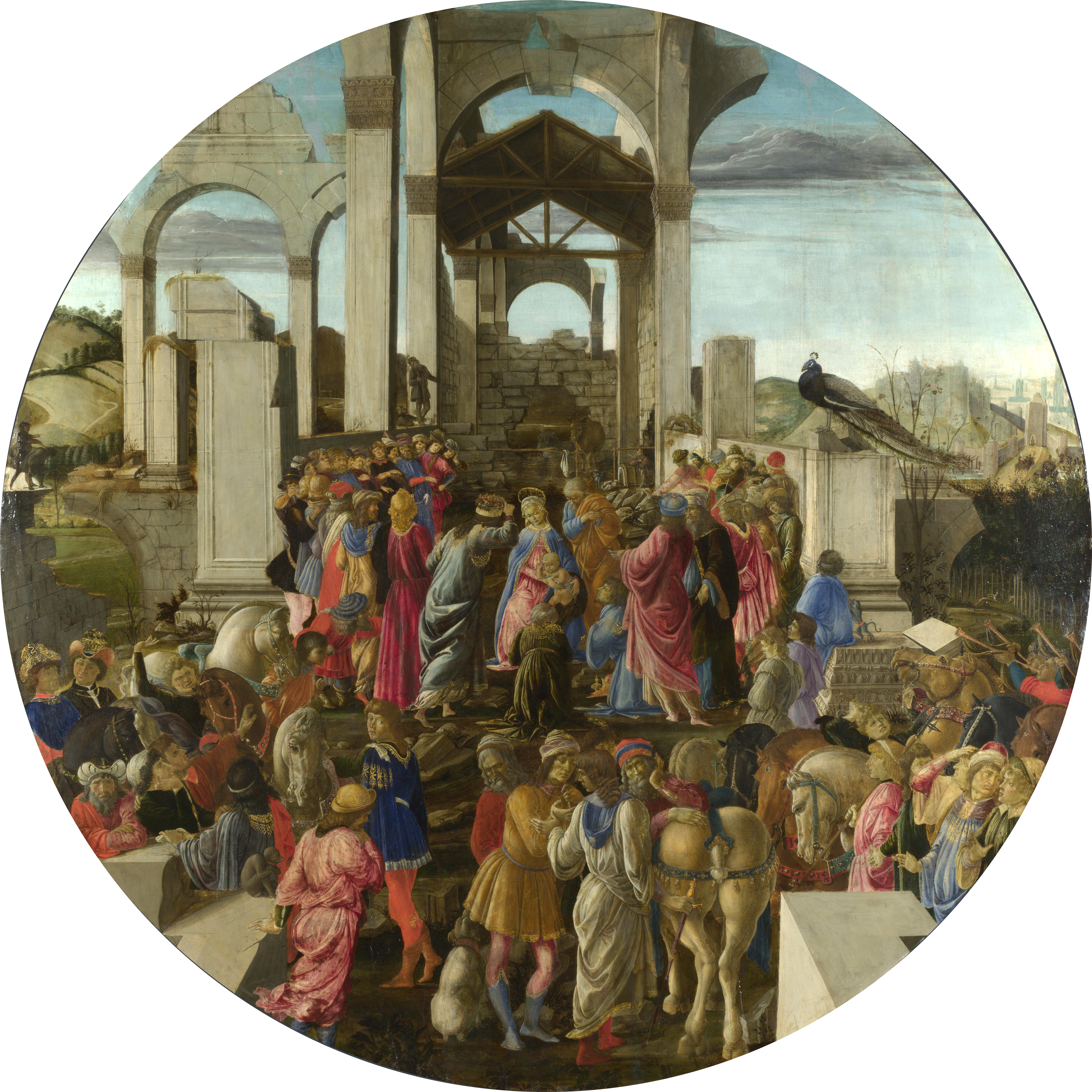 Die Anbetung der Könige im Rundformat wurde 1878 von der Londoner National Gallery aus der Sammlung Fuller Maitland gekauft. Während es in der Sammlung als Werk Botticellis gegolten hatte, führte die National Gallery Filippino Lippi – Schüler Botticellis – als Maler. Die Forschung ist sich jedoch seit langem relativ einig, dass Botticelli als Autor zu gelten hat.1 Dagegen stellt sich in jüngerer Zeit Dombrowski, der das Rundbild aus verschiedenen Gründen wieder Filippino zuschreibt.2