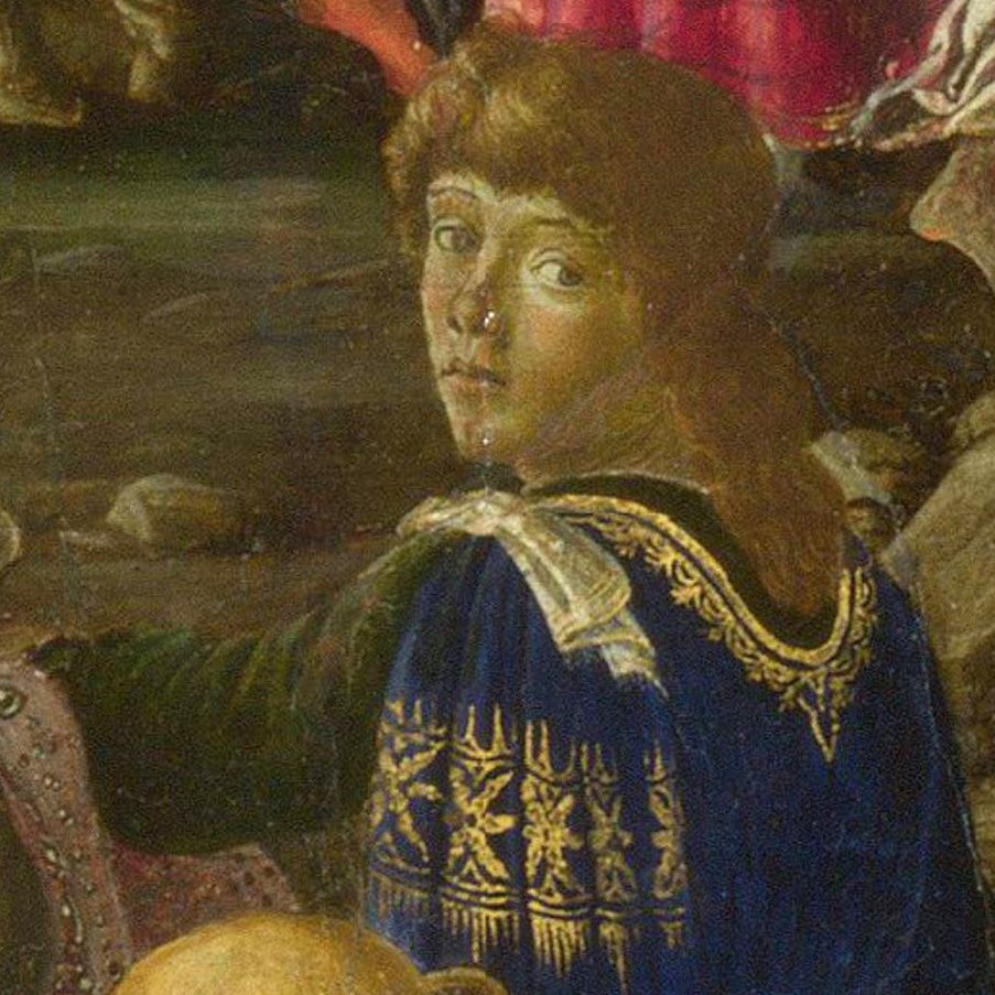Im Idealfall könnten die Frage der Zuschreibung und die Frage nach dem Selbstbildnis gemeinsam beantwortet werden. Tatsächlich lässt sich aber weder zweifelsfrei klären, ob es sich bei der Pagenfigur um ein Selbstbildnis handelt, noch, welcher der beiden in Frage kommenden Maler sich dargestellt haben könnte. Von Filippino Lippi sind u. a. zwei (mögliche) Selbstbildnisse in Disput und Kreuzigung Petri in der Brancacci-Kapelle erhalten – bis auf die Haarfarbe scheint insbesondere das linke (am Rand der Kreuzigung des Petrus) nicht völlig unvereinbar mit der diskutierten Figur im Londoner Tondo. Gerade dieses Selbstbildnis wird jedoch vereinzelt angezweifelt bzw. als mögliches Bildnis Botticellis ins Spiel gebracht.3 Physiognomische Ähnlichkeit lässt sich auch zum „prominentesten“ möglichen Selbstbildnis Botticellis – jenem in der Del-Lama-Anbetung – feststellen. Für Ulmann ist diese Ähnlichkeit ein Argument dafür, dass Botticelli sein Porträt in beide Bilder eingefügt habe. Er geht aufgrund stilistischer und kompositorischer Eigenheiten davon aus, dass das Rundbild nach der Del-Lama-Anbetung, jedoch vor 1480 entstand. Vergleicht man die beiden angesprochenen Figuren miteinander, so wirkt jene im Rundbild aber eindeutig jünger. Sollte sich Botticelli in beiden Bildern porträtiert haben, ist es daher naheliegend, den Tondo vor die Anbetung in den Uffizien zu datieren.4
