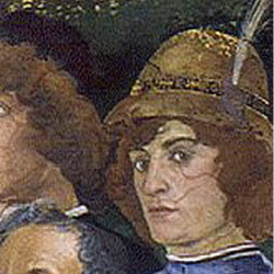 | Zugeordnete Bildprotagonisten: | in einer Dreiergruppe zeitgenössischer Figuren, die in ein Gespräch vertieft scheinen; zweite Figur von links (mit roter Kopfbedeckung) vorgeschlagen als Filippino Lippi |