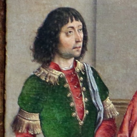 Die Pose mit in die Hüfte gestütztem Arm wurde zeitgleich in Italien angewandt, um Führungsansprüche auszudrücken; vergleichsweise etwas zu sehen beim Selbstporträt Domenico Ghirlandaios in der Vertreibung des Joachim aus dem Tempel. Zur Ikonografie des sogenannten „Triumphellenbogens“ vgl. Merseburger 2016, 122–128.↩︎