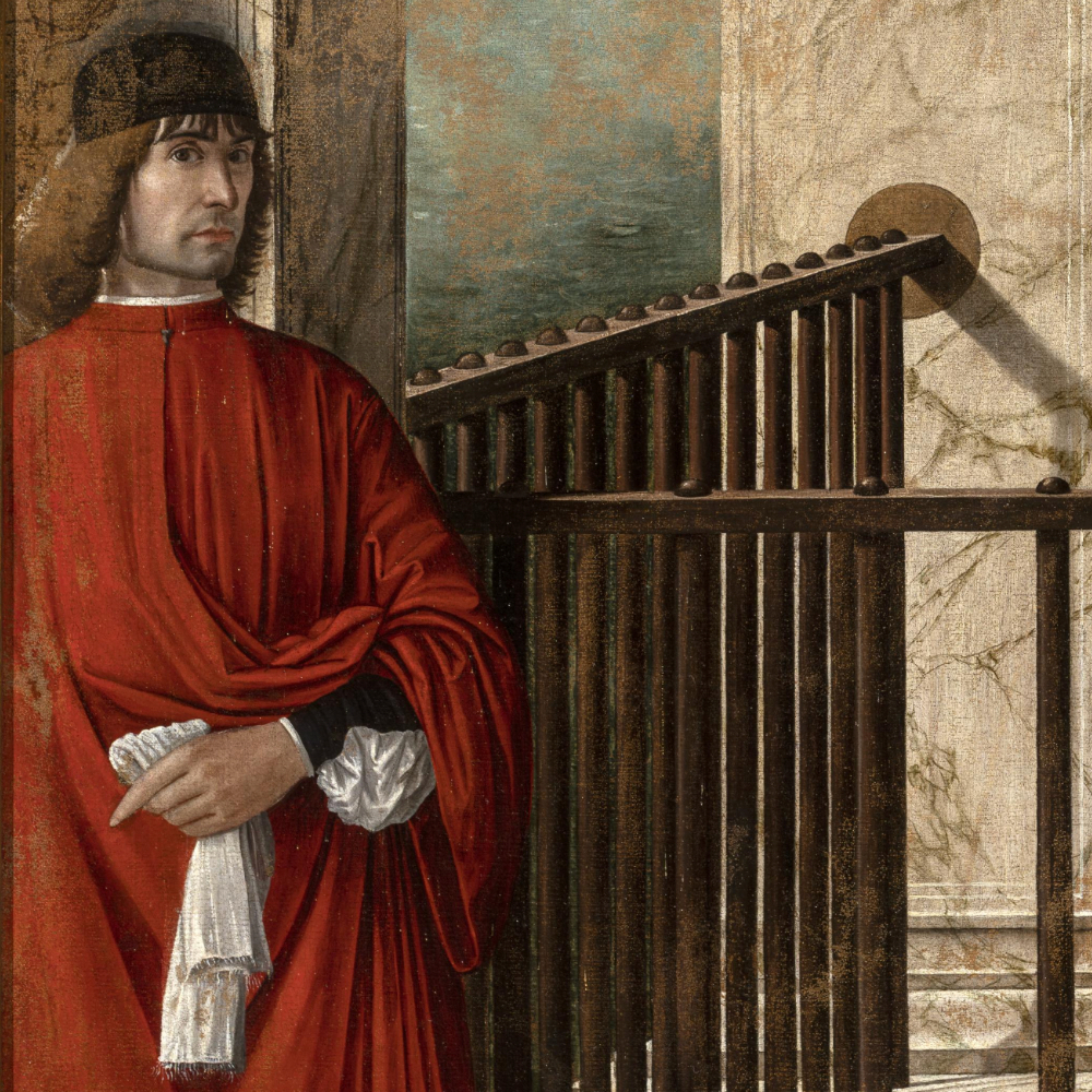 Die Figur am linken Bildrand fällt durch mehrere Eigenschaften auf. Sie ist zunächst in auffallendes Karemsinrot gekleidet, eine Farbe, die an das Rot von venezianischen Würdenträgern erinnert.1 Diese Amtsrobe würde eine Identifizierung mit einem Stifter der Familie Loredan wahrscheinlich machen. Aber auch Künstler haben sich des Öfteren in roter Bekleidung dargestellt: Bei Carpaccio selbst werden in den rot gekleideten Figuren im Disput des hl. Stephanus Künstler vermutet, neben Carpaccio auch sein Sohn und Gentile Bellini. Die Farbe de Tracht würde somit einen sozialen Anspruch verdeutlichen, wie vermutlich auch das auffallende weiße Taschentuch.