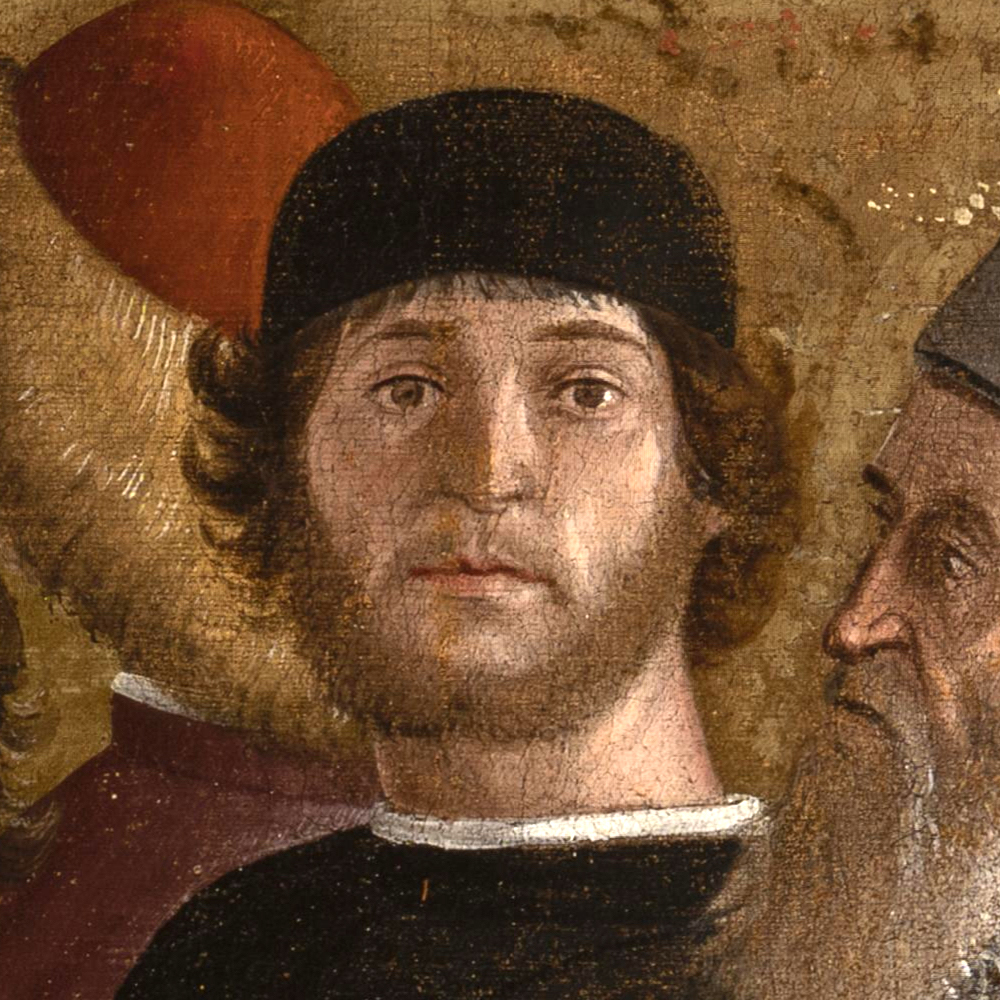 Ihm zugeordnet ist die Figur eines Mannes in schwarzem Talar und mit schwarzer Kappe, in der sich Carpaccio selbst dargestellt haben soll. Der intensive, suchende Blick ist der Einzige im Bild, der sich auf die BetrachterIn richtet, und die Darstellung zeugt von bemerkenswert „suggestiver Porträtqualität“2. In der Komposition des Bildes wird diese Figur besonders durch die vertikale Achse akzentuiert, welche von ihr ausgehend zum Turm der Engelsburg dahinter und deren Fahnenmasten führt. Durch das dunkle kinnlange Haar und den Vollbart mit dem dichten Schnauzer, aber auch die schweren Lider, die feinen Bögen der Augenbrauen und die Mundpartie ergeben sich große Übereinstimmungen mit dem Porträt der Sammlung Giustiniani, welches als Referenzpunkt für Ähnlichkeit gelten kann, und einem weiteren Selbstbildnis, welches im Disput des hl. Stephanus vermutet wird.3 Zudem tragen alle drei Figuren eine sehr ähnliche Bekleidung bestehend aus einem schwarzen Obergewand, unter dem ein weißer schmaler Hemdkragen hervorblitzt, und einer schwarzen Kappe.