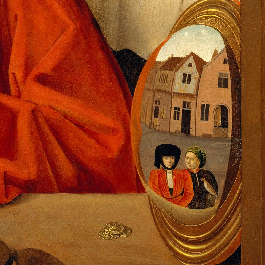 Die Figur des Falkenträgers im gewölbten Spiegel als Selbstporträt ist gleichfalls durch ein großes Vorbild motiviert, das Arnolfini-Verlöbnis von Jan van Eyck. Vilain bemerkt bei seiner Analyse des „autoportrait caché“, dass zwar viele Maler die Darstellungen im gewölbten Spiegel von van Eyck übernommen haben, die Selbstbezeugung mittels eines Porträts aber weniger Nachhall fand: „Si l‘utilisation des ressources pictorales du miroir se prolonge chez Christus, Memling, Juan de Flandes..., ‚l'autoportrait caché‘ semble avoir eu un succès beaucoup plus limité.“7 Eine Deutung des Falkenträgers als Selbstbildnis scheint kaum wahrscheinlich. Es fehlt anders als bei van Eyck eine Inschrift, die einen Hinweis geben könnte. Es wird bei Christus auch ein anderer Bildraum reflektiert als bei van Eyck: Der Spiegel gibt den Außenraum der Straße wieder und nicht den Raum des Geschehens, dadurch öffnet er den Bildraum für die BetrachterInnen, während van Eyck diesem den Zugang eher blockiert.8 Diese Öffnung des Bildraumes nach außen macht eine intendierte Identifizierung mit der betrachtenden Person wahrscheinlicher als jene mit dem Maler. Für Dirk repräsentieren die gespiegelten Figuren die Zeugen des eigentlichen Geschehens im Innenraum.9 Die Neigung des Kopfes als Indiz für ein Selbstporträt zu deuten, wie es das Autorenpaar Hagen vermutet, scheint zweifelhaft.10 Wohl aber könnte der Blick zur BetrachterIn als Hinweis auf ein Selbstbildnis gedeutet werden, die Figur ist zudem die einzige, die aus dem Bild blickt. Durchaus plausibel lässt sich der Blick aber ebenso als originelle Alltagsbeobachtung erklären, die zeigt, wie ein Passant im Vorbeigehen neugierig auf sein Spiegelbild aufmerksam wird. Weitere Gegenargumente sind zum einen die modische, wenn nicht höfische Kleidung der Figur sowie der Falke, war die Falkenjagd doch ein adeliges Privileg. Zum anderen weist auch die Symbolik des Spiegels im Bildzusammenhang eher in eine negative Richtung, was einer Interpretation als Selbstbildnis zuwiderläuft. Spiegel, modische Kleidung und Falke können nämlich als Anspielungen auf die Laster der Gier und Hoffart verstanden werden. Kreisrunde Bläschen im Spiegel gelten Milman zufolge als Hinweis auf Seifenblasen und damit auf die Vergänglichkeit des Menschen.11 Auch diese moralisierende Interpretationslinie erschwert die Deutung als Selbstbildnis mehr, als dass sie sie untermauern könnte. Aus dem Bildkontext lässt sich also ein Selbstporträt nicht motivieren. Es scheint vielmehr, dass Christus das Spiegelmotiv van Eycks übernommen hat, um daraus eine genrehafte Szene zu bauen.