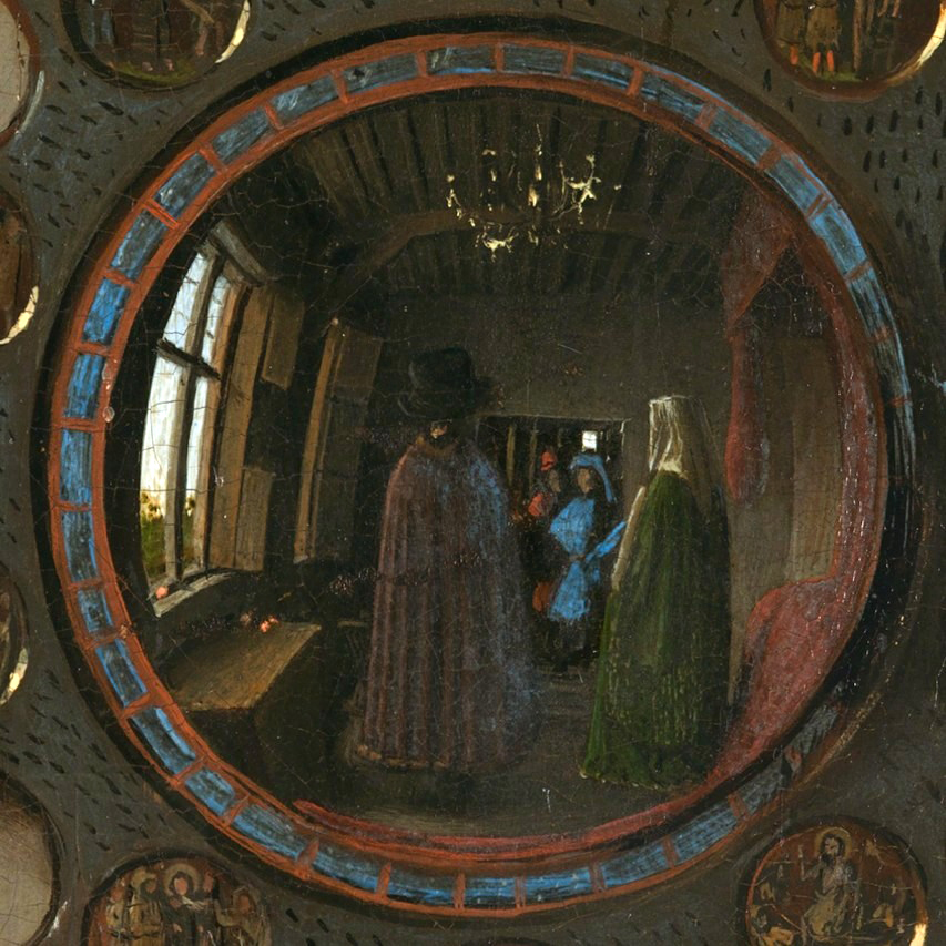 In der Frühen Neuzeit galten Spiegelungen als Anspielungen auf antike und darauf aufbauende spätmittelalterliche Theorien zur Lichtreflexion – in der Malerei galten diese als prägnantes Mittel, um den Kern des Mediums auszudrücken.3 Die Verbindung von Spiegelungen und Selbstporträts, insbesondere in illusionistischen konvexen Flächen, stellt jedoch ein seltenes Phänomen dar. Im Arnolfini-Doppelbildnis verschmelzen diese Aspekte zu einem höchst reflexiven Zeichensystem, wie es eingehend analysiert worden ist. 4