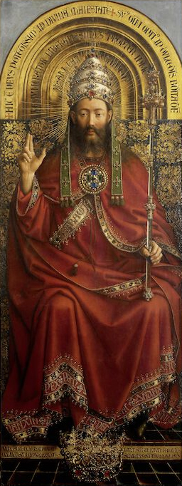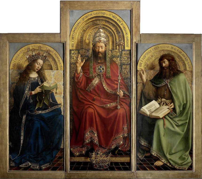| Ikonografie Anmerkungen: | Die zentrale Gottesgestalt steht in Zusammenhang mit den beiden großen Figuren links und rechts, der Gottesmutter und Johannes dem Täufer. In der Zusammenschau entspricht die Gruppe einer Deësis, die van Eyck jedoch abwandelte: Maria erscheint als thronende Königin, Johannes der Täufer ist mit einem Buch anstelle des Lamms dargestellt, die zentrale Figur mit ihren Attributen (Tiara, Zepter, Krone) kann auf weltliche und göttliche Macht anspielen; sie wird als Gottvater, Pantokrator, Dreifaltigkeit und Christus interpretiert. |