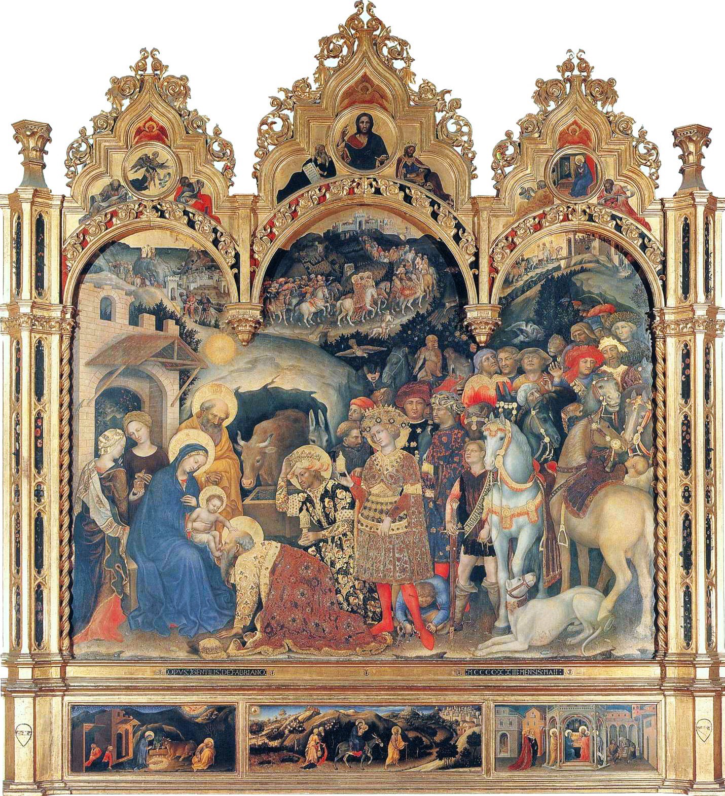 Die Anbetung der Könige bildet die Haupttafel der Pala Strozzi. Der Altar gehörte ursprünglich zur Ausstattung der Familienkapelle der Strozzi in der Florentiner Kirche S. Trinita.1 Der Altar mit der Darstellung der Anbetung der Heiligen Drei Könige auf der Haupttafel wurde von Palla di Nofri di Strozzi zur Ausschmückung der von seinem Vater Onofrio oder Nofri initiierten Familienkapelle in der Sakristei der Kirche S. Trinita in Florenz in Auftrag gegeben. Die Strozzi gehörten zu diesem Zeitpunkt zu den reichsten Familien der Stadt und versuchten mit ihrem Lebensstil den oberitalienischen Fürstenhöfen nachzueifern.2 Palla war persönlich sehr am aktuellen Kunstgeschehen interessiert und trat als humanistisch gebildeter Kunstmäzen in Erscheinung; die Gestaltung der Kapelle erfolgte z. B. durch Lorenzo Ghiberti.3 Für den Altar beauftragte er einen ebenfalls arrivierten Künstler; Gentile da Fabriano; der zuvor für den Papst gemalt hatte.4 Dessen erzählerische und detailfreudige Malweise schien ihm wohl adäquat; eine möglichst aufsehenerregende Tafel für das Prestige-Projekt der Familienkapelle zu schaffen.5 Die bemerkenswerte Wiedergabe der stofflichen Qualitäten wird der durch Tuchhandel wohlhabend gewordenen Familie entgegengekommen sein;6 vor allem aber entsprach der höfisch-aristokratische Charakter des noch der internationalen Gotik verhafteten Gentile den Wünschen des gesellschaftlichen Parvenüs.7 Die selbstbewusste Signatur des Künstlers auf der Rahmenleiste wird nicht ohne Zustimmung des Auftraggebers zustande gekommen sein; der sein eigenes Prestige mit dem Namen des angesehensten Malers seiner Zeit erhöhen konnte.
