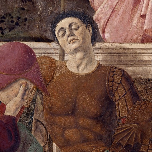 Trenti erkennt 1992 in den Zügen des schlafenden Soldaten eines von drei plausiblen Selbstporträts im Werk Pieros, die anderen beiden finden sich auf der Misericordia-Tafel und in der Begegnung der Königin von Saba mit Salomon in Arezzo. Die Zuweisungen beruhen auf einer Überlieferung, die nach Trenti von fast allen ForscherInnen akzeptiert werde, „una tradizione […] più o meno accettata da tutti i critici“.11 Als Argument für die Ähnlichkeit der Selbstporträts dient ihm eine gut sichtbare Schwellung am Hals der Figur, „una evidente tumefazione nelle parte anteriore de collo“.12