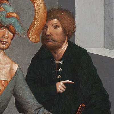 Die These, dass es sich bei der Vordergrundfigur um ein Selbstbildnis des Malers und bei den beiden weiteren, schwarz gekleideten Protagonisten im Mittel- und Hintergrund um kryptomorphe Bildnisse handelt, basiert auf der ostentativ mediatorischen Rolle der Figur im Vordergrund, auf einem Vergleich mit einer physiognomisch ähnlichen, über eine Signatur verifizierten Selbstdarstellung in der Gefangennahme des Täufers im selben Altar sowie dem offensichtlichen internen Zusammenhalt der drei in schwarz gekleideten Figuren,1 die allesamt keine ikonografischen Funktionen im Gemälde wahrnehmen.2