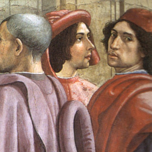 | Zugeordnete Bildprotagonisten: | Figur links neben dem Selbstporträt, vorgeschlagen als Sebastiano Mainardi und auch als Davide Ghirlandaio; Rückenfigur links vor dem Selbstporträt, vorgeschlagen als Filippo Strozzi, als Neri di Gino Capponi, als dessen Sohn Gino di Neri Capponi oder als Leon Battista Alberti |