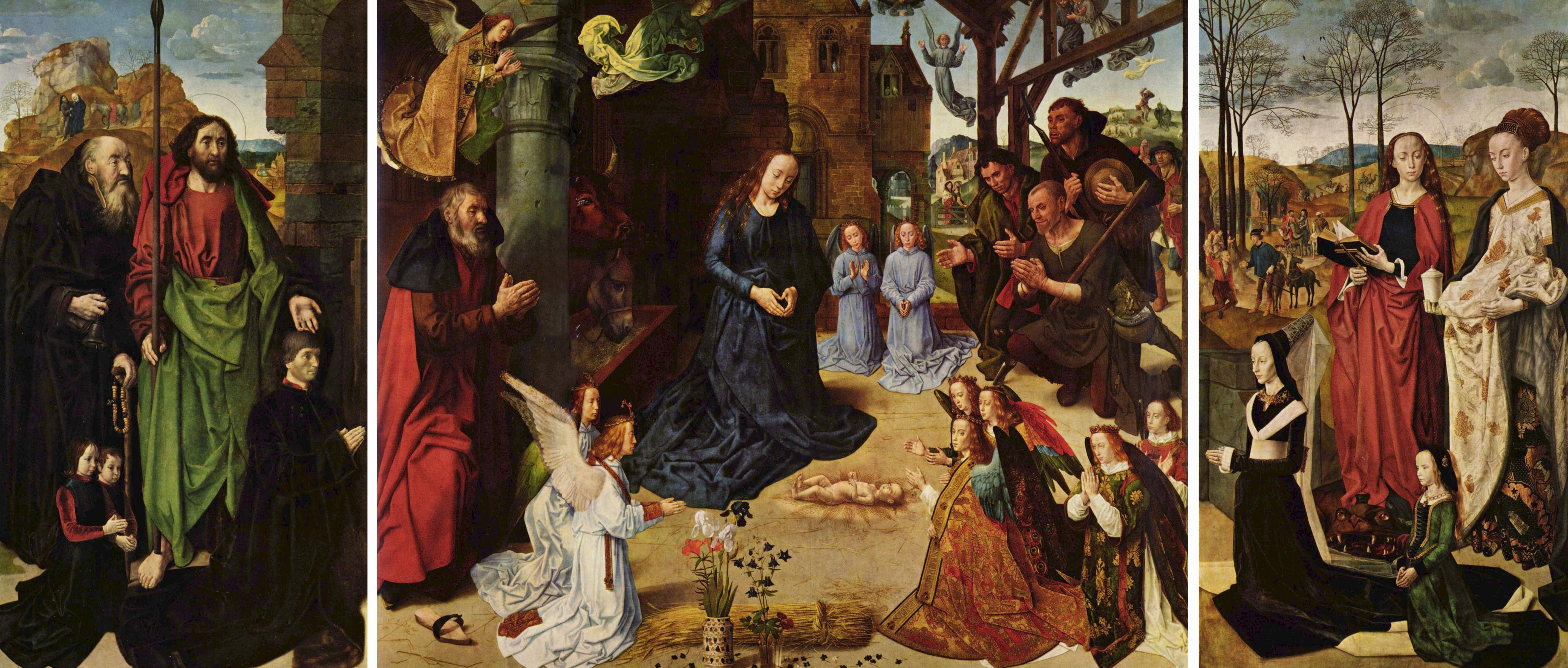 Details zu Auftragssituation, Funktion und Konzeption des Altars sowie zu Vorbildern (bes. Rogier van der Weyden, Bladelin-Altar, 1445–50, Berlin, Gemäldegalerie; Petrus Christus, Geburt Christi, 1460er Jahre, Washington, National Gallery of Art; Gebrüder van Eyck, Genter Altar) bietet neben vielen anderen Franke 2021. Eine detaillierte Analyse von Vorbildern und Bezugnahmen erarbeitet u. a. Ridderbos 2005, 100–125; Ridderbos 2008, bes. 58–63. Sander verweist zudem auf die Vorbildwirksamkeit eines Wandbildes im Groot Vleeshuis in Gent, vgl. Sander 1992, 215–220.↩︎