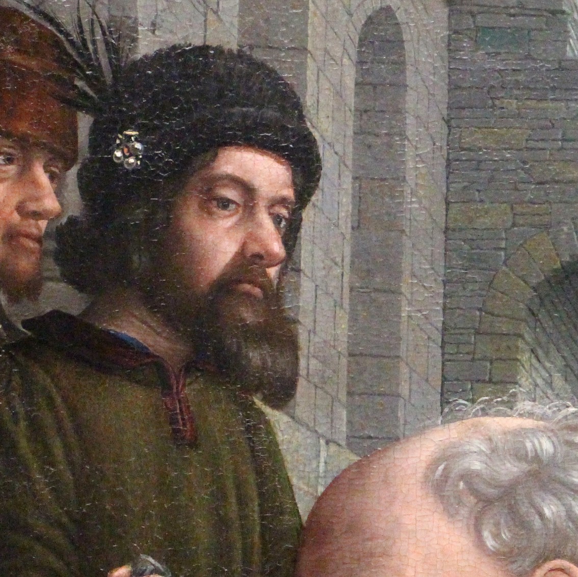 | Andere Identifikationsvorschläge: | südländisch wirkender Freund oder Kollege von van der Goes; ein Gefolgsmann der Könige; ein hoher Beamter; ein Mann, der über den Redegestus das Wort verkörpere |