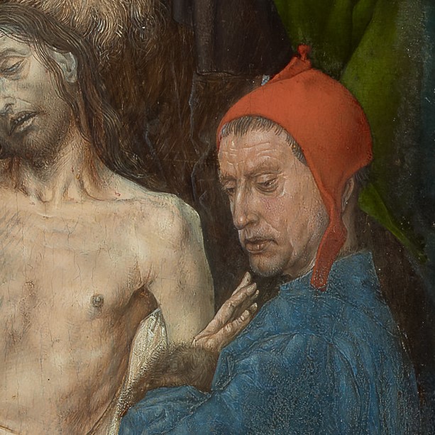 1998 lehnt Dhanens Dennys Vorschlag ebenfalls ab.9 Das Porträt verdeutliche über die expressive Geste der zur Brust geführten Hand Empathie gegenüber der Passion. Zusammen mit der Figur der Maria Magdalena gebe es der Komposition Struktur und Halt. Die Kleidung weise den Mann als Angehörigen der Bourgeoisie des 15. Jahrhunderts aus, weshalb Dhanens ein Stifterporträt annimmt.10