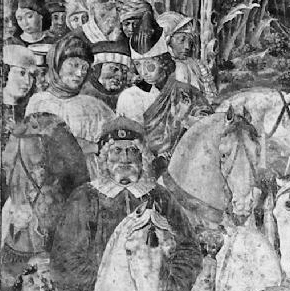 Rosini erwähnt erstmals 1829 in seiner Beschreibung des Camposanto ein Selbstbildnis des Künstlers bei der Szene der Anbetung. Er geht von eine mündlichen Tradition aus und beschreibt einen jungen Mann zu Pferd mit Kapuze und lokalisiert ihn am rechten Bildrand: „Dicesi che nel volto di quel giovine a cavallo (ch’ è l’ultimo a destra) con un cappuccio incapo, Benozzo abbia effigiato il proprio ritratto.“1 Die Zuweisung erweist sich als schwierig, da sich keine Figur mit Kapuze auf der rechten Seite befindet.