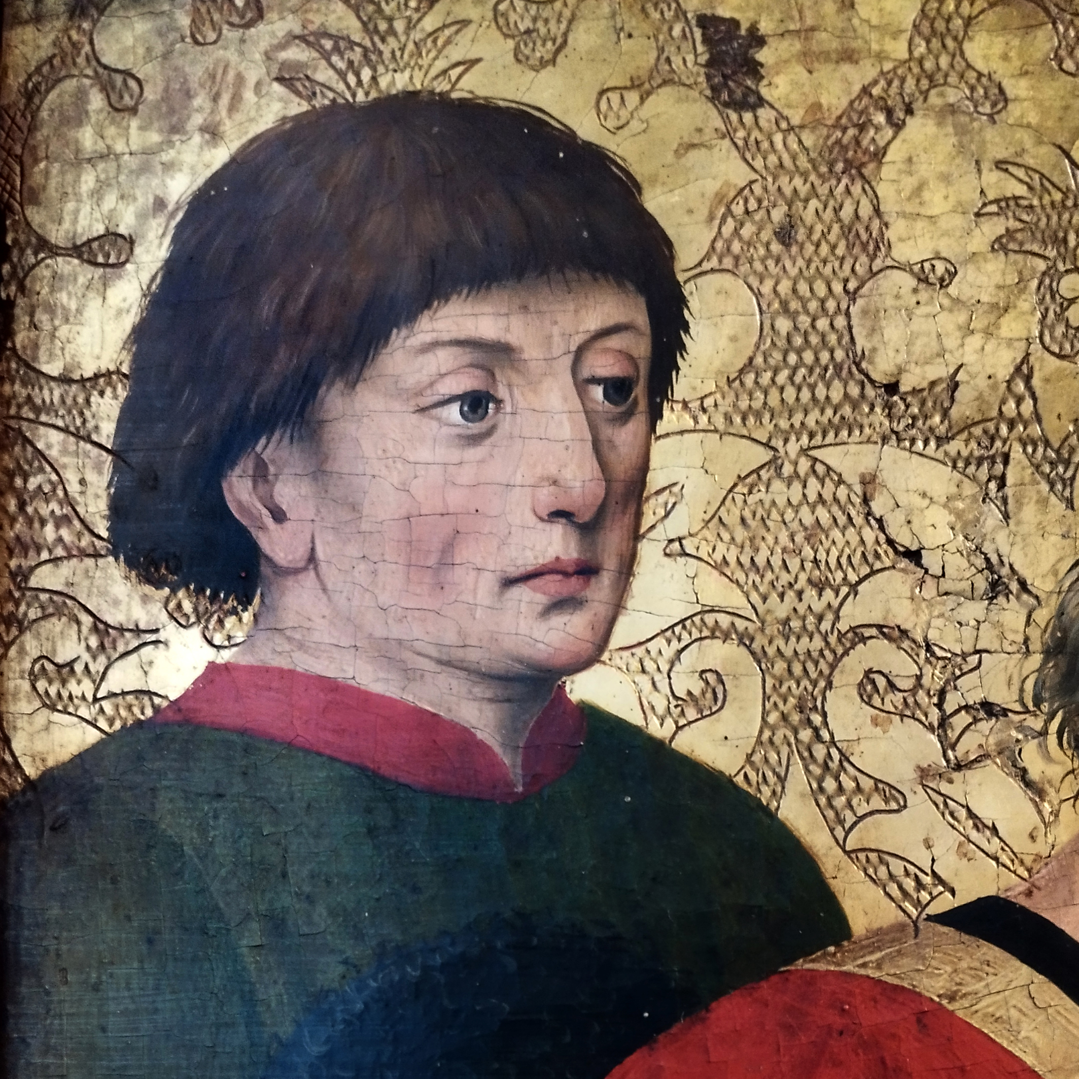| Interaktion/Raum-, Bildraumbeziehung/ Alleinstellungsmerkmal: | Verankerung am äußerst linken Bildrand, von diesem und dem vorgelagerten Priester überschnitten; mit der ebenfalls zeitgenössisch gekleideten Frauenfigur im gegenüberliegenden Bildrand in Zusammenhang stehend; deutlich von der sakralen Handlung differenziert |