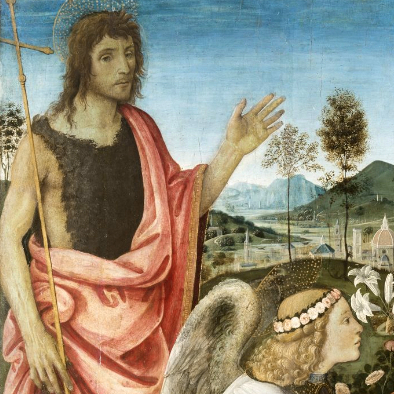 Mengin (1932) schreibt das Gemälde aus stilistischen Gründen Filippino zu und zeigt sich überzeugt, dass der hl. Johannes der Täufer dieselben Gesichtszüge trägt wie jener in der Pala degli Otto bzw. wie die von Mengin angenommenen Selbstbildnis-Figuren im Drachenwunder des hl. Philippus und in der Anbetung der Könige (ehem. San Donato a Scopeto). Somit reihe sich die hier diskutierte Figur in die idealisierten Selbstbildnisse Filippinos ein, die durch ein schönes und zartes Gesicht mit einer leicht chaotischen Haarpracht ausgezeichnet seien. Für im Zusammenhang mit dem Selbstbildnis stehend hält Mengin auch die im Hintergrund detailliert ausgeführte Stadtansicht von Florenz.1