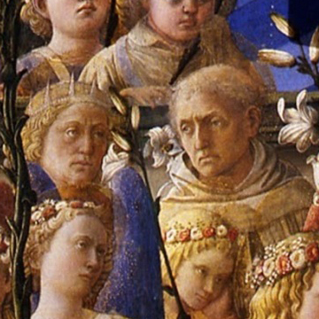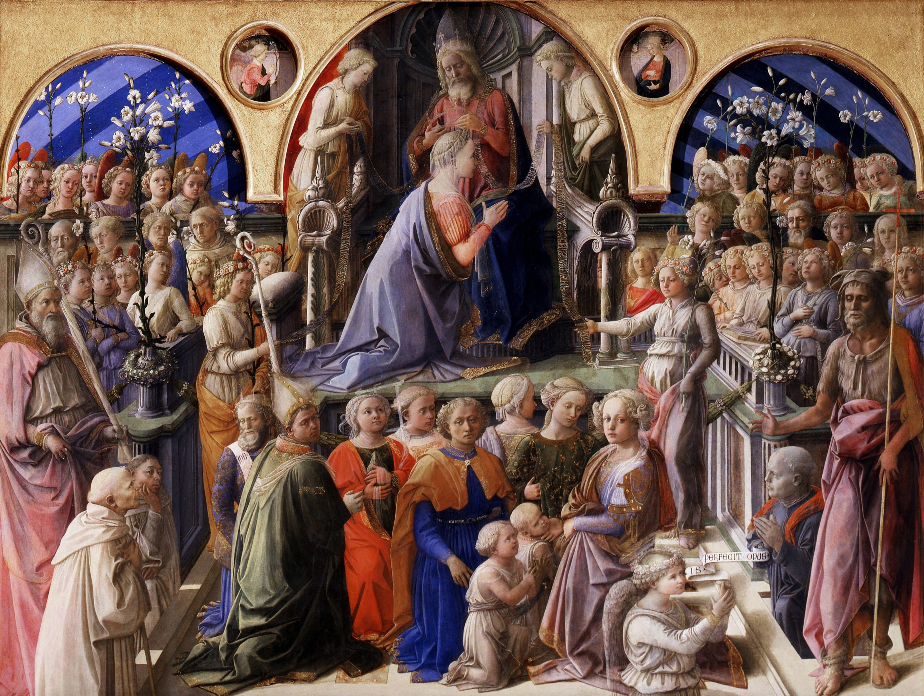 Bocchi (1677) schreibt, Fra Filippo habe sein Selbstbildnis in einer knienden Figur auf der linken Seite der Marienkrönung eingefügt. Auf welche Figur konkret sich der Autor bezieht, bleibt unklar.1