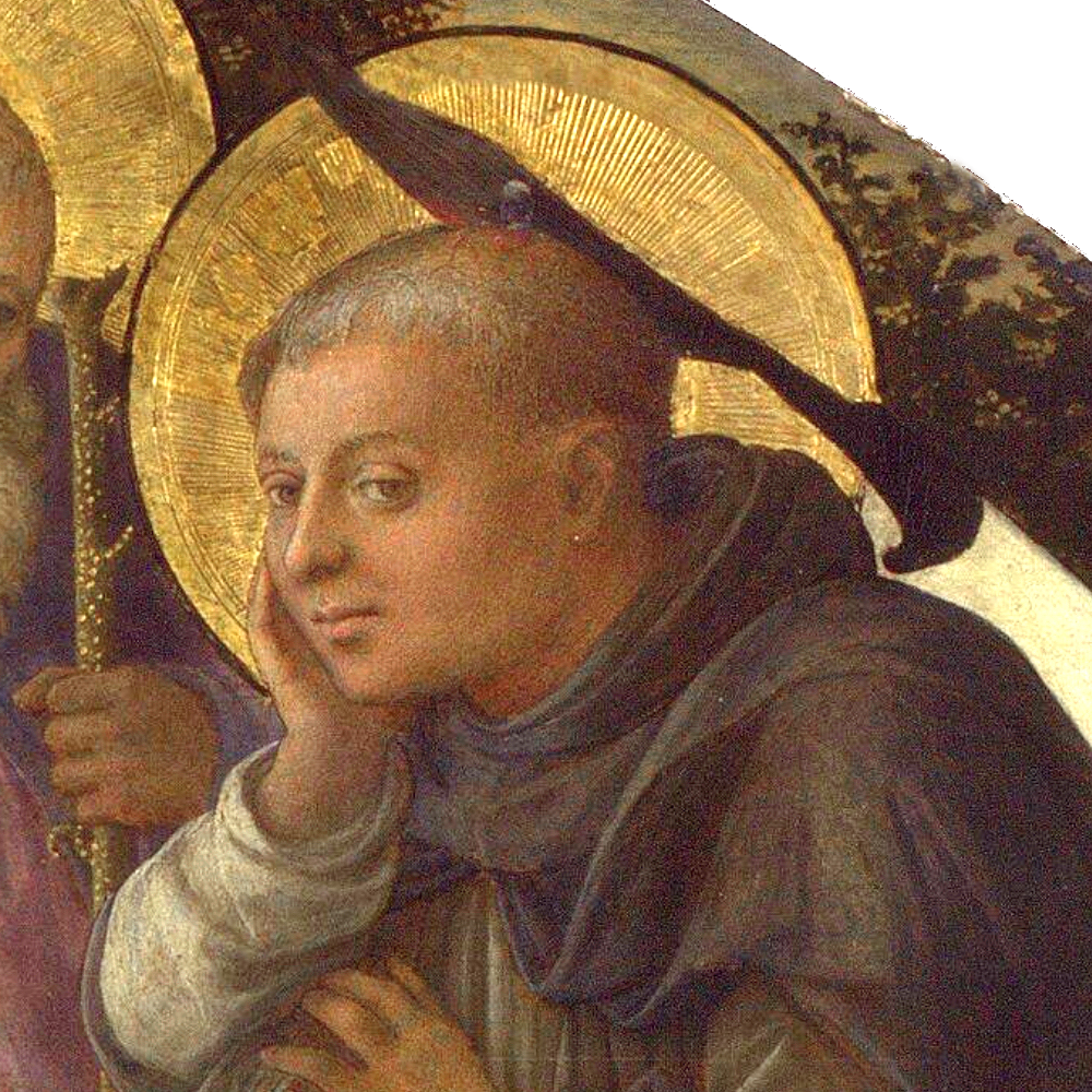 Rossi begründet seinen sicher vorgetragenen Vorschlag, im hl. Petrus dem Märtyrer ein Selbstbildnis Fra Filippos zu sehen, nicht. Möglicherweise fiel dem Autor die Haltung des Heiligen mit dem in die Hand gestützten Kopf auf, die Fra Filippo mehrfach für Selbstbildnisse verwendet haben könnte (siehe die vermuteten Selbstbildnisse in der Marienkrönung, in der Pala Barbadori und in der Disputation in der Synagoge sowie die Vorbemerkung zum Künstler).1 Dies allein dürfte jedoch für eine Identifizierung nicht ausreichen, liegt es doch nahe, dass der Maler die Pose nicht exklusiv für seine Selbstbildnisse verwendete, sondern auch für andere Figuren einsetzte, wenn ihm dies passend erschien. Der hl. Petrus sieht anderen möglichen Selbstbildnissen Fra Filippos, etwa jenem links unten in der Marienkrönung, zwar nicht unähnlich, insgesamt scheint es dennoch eher unwahrscheinlich, dass Fra Filippo sich in dieser Tafel selbst porträtierte.