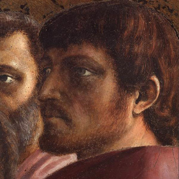 Salmi merkt an, dass die Figur sich von den übrigen Aposteln in ihrer Kleidung unterscheide.5 Tatsächlich sind bei den meisten Aposteln sowie bei Jesus die in kontrastierenden Farben ausgeführten Tuniken und togaartigen Mäntel sichtbar, bei der hier diskutieren Figur hingegen sieht man nur einen voluminösen Mantel. Die einfachste Erklärung ist jedoch, dass die Tunika lediglich aufgrund der Ausrichtung der Figur nach links Richtung Bildmitte versteckt bleibt. Denn üblicherweise – und so auch im Zinsgroschen – bedeckt eine Toga den linken Arm und lässt den rechten frei. Somit ist wohl auch keine Auszeichnung der Figur durch andersgeartete, etwa zeitgenössischere Gewandung gegeben, die zur Suche nach einem speziellen Porträtvorbild ermutigt hätte.