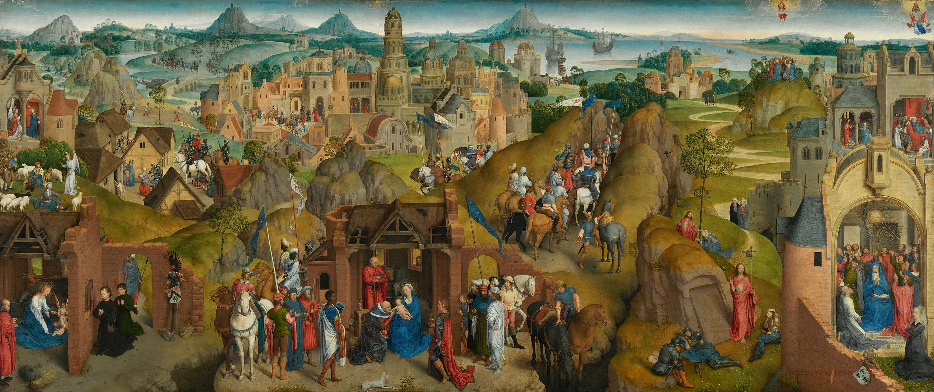 Das Panoramabild der Sieben Freuden Mariens ist nach De Vos eine der „wohlüberlegtesten […] erzählenden Kompositionen in der Malerei des 15. Jahrhunderts.“1 Vom Raumprinzip an Memlings Passionspanorama2 anknüpfend, behandelt das Gemälde in 253 simultanen Bildern die vier großen Kirchenfeste: Weihnachten, das Fest der Heiligen drei Könige, Ostern und Pfingsten; die Epiphanie stellt hierbei die Hauptszene dar.4 Stevens,5 der spätmittelalterliche Kunst und Dramen nach Intertextualität untersucht und Zusammenhänge zwischen den Medien thematisiert, fokussiert auf Memlings Passionspanorama, nicht ohne dabei auf Zusammenhänge auch zum Panorama der Sieben Freuden Mariens zu verweisen.6 Der Autor macht Kunst als Vision des Malers greifbar,7 als Neuinterpretation,8 die gerade in bühnenartigen Darstellungen – wie im vorliegenden Fall – zur Gänze auf die RezipientIn ausgerichtet ist. Die BetrachterIn wird mit in dramatischer Gleichzeitigkeit dargestellten Einzelszenen konfrontiert.9