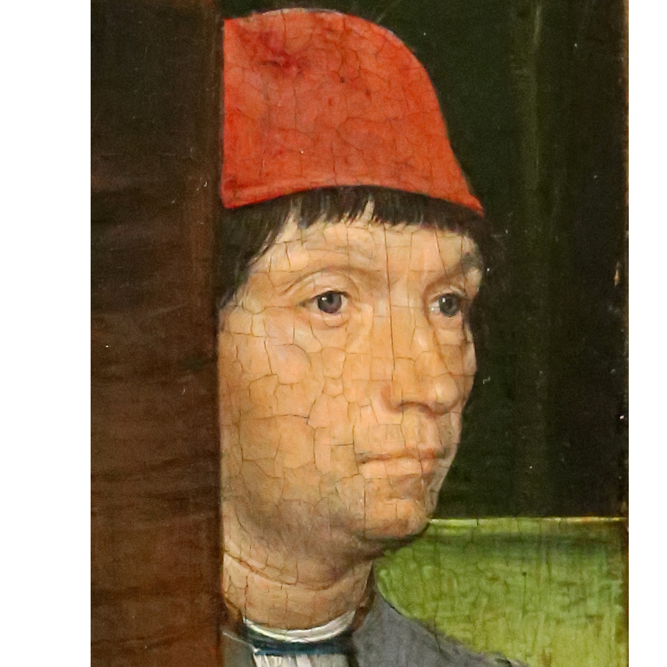 „On the left wing, bearing a representation of John Baptist, the artist’s patron saint, he has introduced into the background what must be a portrait of himself in his working attire.“1 Conways (1887) Erstidentifizierung basiert auf einem Vergleich mit einer Notiz aus dem 16. Jahrhundert zu einem mittlerweile verlorenen Selbstbildnis.2 Wie in Marcanton Michiels Aufzeichnungen zur Malerei beschrieben, habe sich Memling „piu tosto grasso“ und „rubicondo“3 dargestellt, diese Charakteristika will Conway auch in der Figur des Donne-Altars erkennen.4