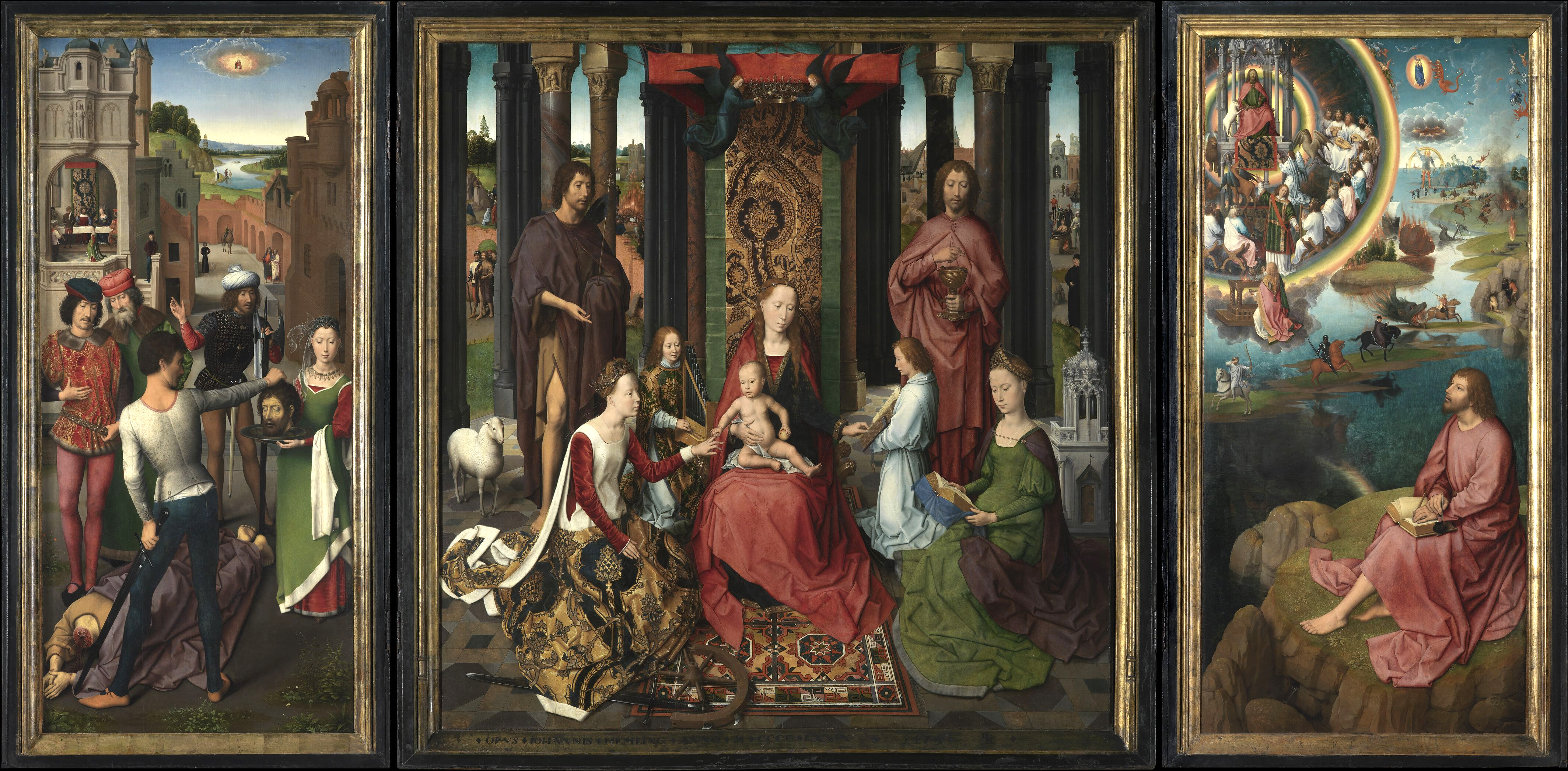 | Auftraggeber/Stifter: | vier leitende Geistliche des Johannes-Hospitals in Brügge: Jacob de Ceuninc (Bruder), Antheunis Seghers (Vermögensverwalter), Agnes Casembroods (Priorin), Clara van Hulsen (Schwester, zuständig für Almosen und Speisen); Stifter identifiziert von Weale 1871 |