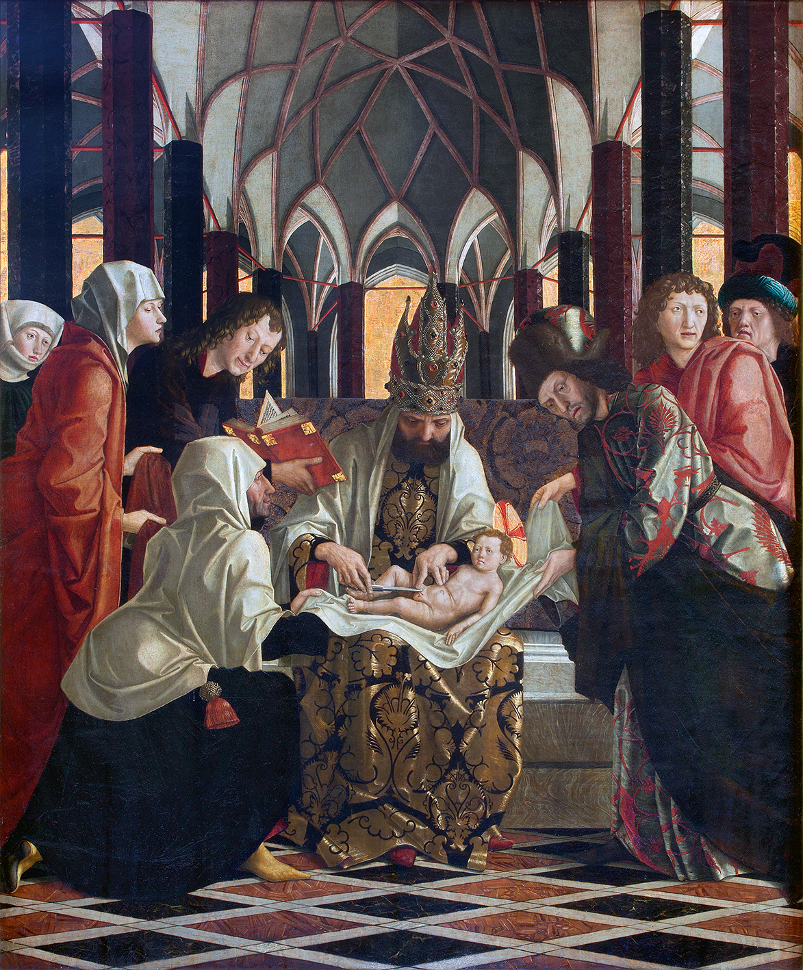 | Maße Anmerkungen: | Teil der Schreinflügel des Altars: Gesamt 16 Bilder auf zwei Flügelpaaren, je 386 x 164 cm (mit Rahmen), Einzeltafeln: Innenflügel je 177 x 146,5 cm, Außenflügel je 177 x 141 cm. Die Beschneidung befindet sich auf der Innenseite des linken Innenflügels im unteren Register, ist im geöffneten Zustand des Altars sichtbar und ist Teil von vier Szenen aus dem Marienleben: Geburt Christi, Darbringung Christi im Tempel, Beschneidung Christi, Marientod |