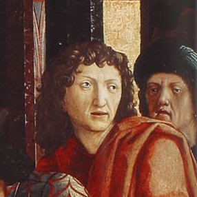 DetailsSchwabik unterstreicht seine Ausführungen anhand einer Abbildung zweier Figuren am rechten Bildrand des Gemäldes, aus der nicht eindeutig hervorgeht, welches Bildnis der Autor meint. Auf Grund der Beschreibung des Blickes („l’artista guarde lontano“) fällt die Wahl auf die zweite Figur von rechts.