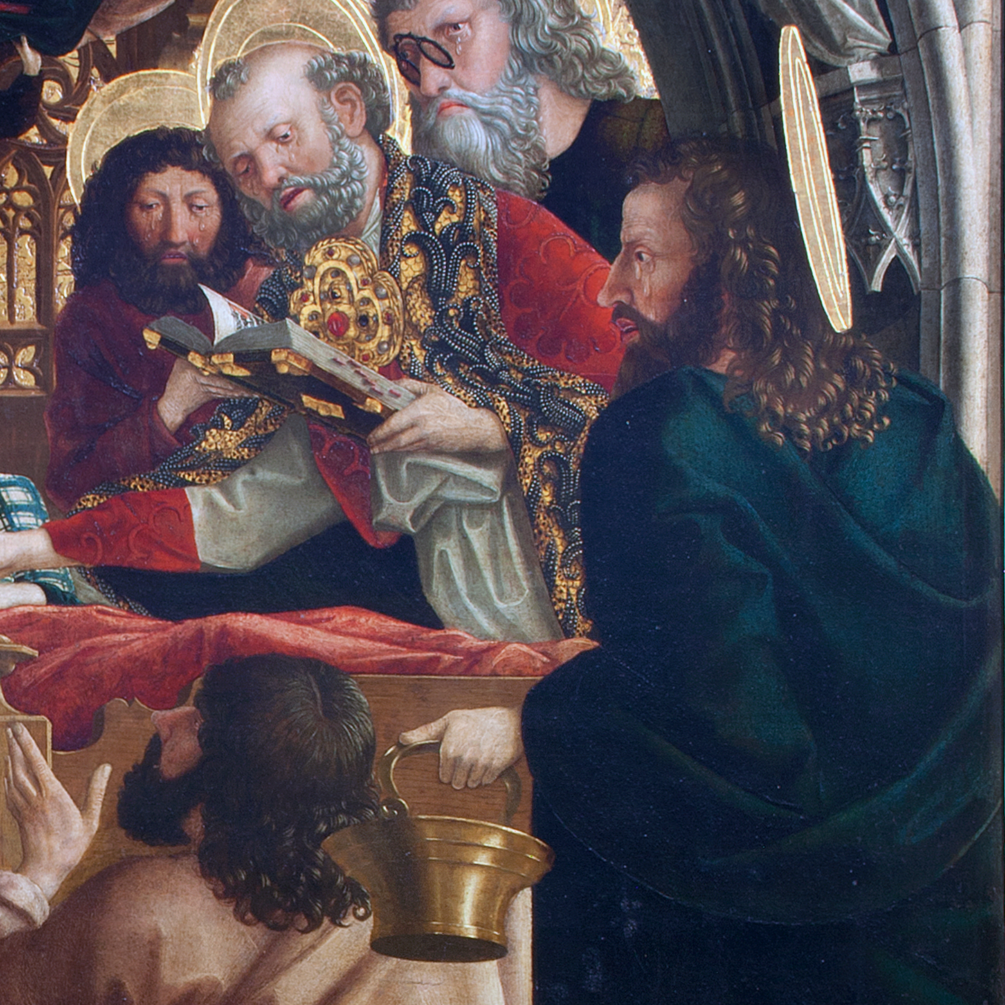| Zugeordnete Bildprotagonisten: | alle Jünger, besonders: Jünger am rechten Bildrand mit Weihrauchkessel; kniender Jünger am Fußende des Bettes, identifiziert als Dionysius Areopagita; Apostel mit Brille im rechten hinteren Bildbereich, identifiziert als hl. Paulus (beide Zuweisungen von Thurmann); Christus mit Engeln am oberen Bildrand; Maria; Figur am rechten Bildrand in der Hochzeit zu Kana im selben Altar, Zusammengehörigkeit vorgeschlagen von Stiassny; Figur in roter Kleidung am rechten Bildrand der Beschneidung Christi im selben Altar, Blickverbindung vorgeschlagen von Reichenauer |