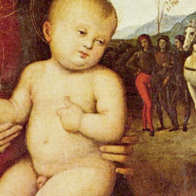 Prinz (1966) identifiziert ein Bildnis in der Tafel der Madonna mit dem Kind als Selbstporträt Peruginos; der Maler sei in der zweiten Figur im rechten Hintergrund zu erkennen und trage dieselbe Kappe wie in seinem Bildnis im Collegia del Cambio.1 Zudem ist laut Prinz in der Figur neben Perugino Raffael abgebildet.2