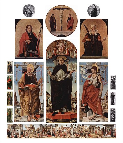 Die in mittlerer und hinterer Bildebene synchron dargestellten Episoden aus den Wundertätigkeiten des hl. Vinzenz Ferrer4 folgen einem Rhythmus, der sich aus Zäsuren, Freiflächen und konzentrierten Handlungsebenen einstellt. Der angestrebte Einheitsraum entwickelt sich sowohl in die Breite als auch in die Tiefe, führt in unbestimmte Bildgründe und in den BetrachterInnenraum, was sich insbesondere über an vorderster Bildebene angesiedelte, stark beschnittene Bildelemente zeigt (etwa das Pferd in Rückenansicht). Veduten und Landschaftselemente, Charaktere unterschiedlichster Nationen in verschiedenen Zeit- und Handlungsebenen (darunter das vermutliche Selbstbildnis) besiedeln die bühnenartig aufgebaute szenische Zusammenschau und aktualisieren das Gemälde, zudem überführen sie es auch in Allgemeingültigkeit. Wie Mosso betont, darf die Predella als innovative und experimentelle persönliche Interpretation antiker Friese interpretiert werden, die den Maler in Dialog mit etwa Giovanni Bellini oder Andrea Mantegna bringt.5