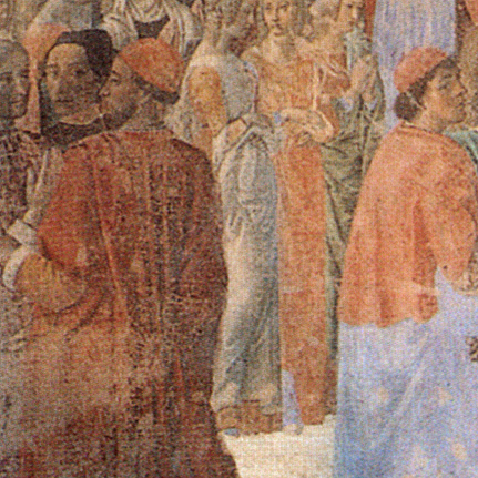 Ein Vorbild für Rosselli dürfte Masaccios Darstellung der Sagra im Kreuzgang der Florentiner Kirche Santa Maria del Carmine gewesen sein,8 in der ebenfalls die Bildnisse zahlreicher Zeitgenossen sowie ein Selbstbildnis vermutet werden. Vor Rosselli griff Ghirlandaio in der Sassetti-Kapelle auf Masaccios Bildfindung zurück,9 auch Ghirlandaio dürfte dort in den Exequien sich selbst und Angelo Poliziano porträtiert haben. Auch in Sant’Ambrogio findet sich mit der linken Randfigur, die in der Forschung bislang kaum beachtet wurde, eine weitere Person, die aufgrund ihrer räumlichen Nähe zur hier diskutierten Figur und aufgrund der nahezu identen Kleidung (nur diese beiden Figuren tragen im Bildvordergrund ein schwarzes Gewand, das einen weißen Kragen sichtbar lässt, sowie eine schwarze Kopfbedeckung) eine gewisse Zugehörigkeit zum möglichen Selbstbildnis demonstriert. Diese Kleidung zeichnet wiederum auch das vorgeschlagene Selbstbildnis Rossellis in der Bergpredigt aus.