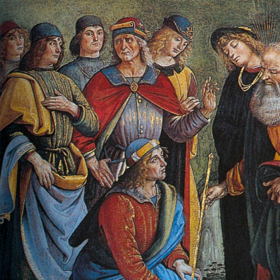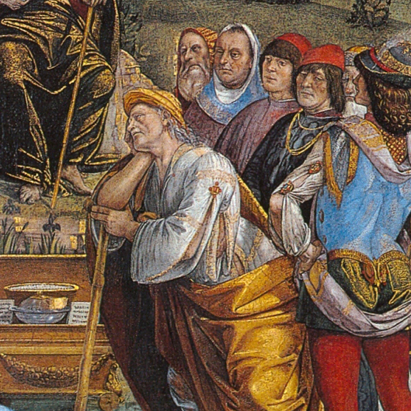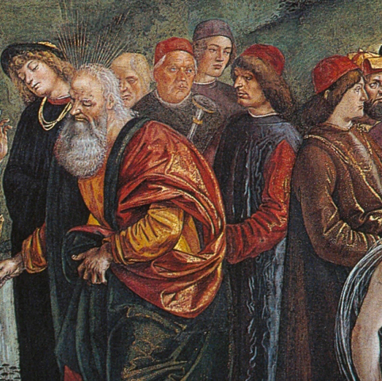 | Zugeordnete Bildprotagonisten: | übernächste Figur rechts vorgeschlagen als Selbstbildnis von Luca Signorelli oder Selbstbildnis von Pietro Perugino |