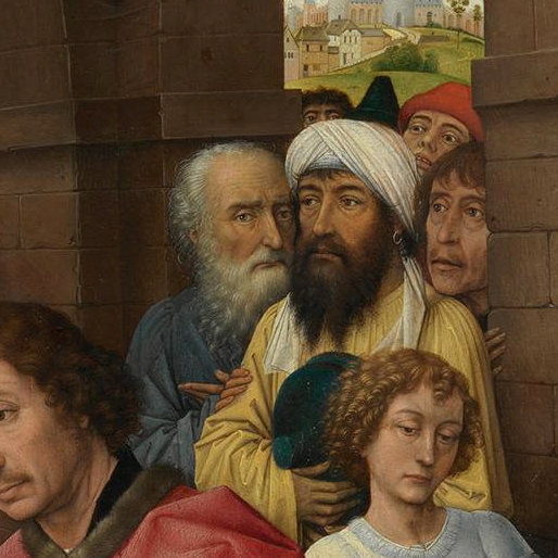 2012 erklärt Franke, dass es sich beim Mann mit dem weißen Bart im Gefolge der Könige um eine Selbstdarstellung Rogier van der Weydens handle, die die Autorin über eine weitreichende Argumentation untermauert. Nach der Identifikation der Figur über einen physiognomischen Abgleich mit der von der Autorin akzeptierten Kopie einer Selbstdarstellung Rogiers im Trajan und Herkinbaldteppich3 zieht Franke Vergleiche mit der Selbstdarstellung von Hugo van der Goes im Monforte-Altar, der als kompositorisches Vorbild für den Columba-Altar gilt. Wie das mögliche Selbstbildnis von Hugo van der Goes mit blauer Kappe, befinde sich auch das Selbstbildnis van der Weydens in einer isolierten Position abseits der sakralen Handlung am rechten Rand der Königsanbetung. Die Sonderstellung der van der Weydenschen Selbstdarstellung sei über den in den BetrachterInnenraum gerichteten Blick sowie über die damit einhergehende Abwendung vom Geschehen betont, auf das der Bärtige mit dem gestreckten Finger der einen Hand weist. Wesentlich für die Interpretation des Selbstverständnisses von Rogier van der Weyden, so Franke, sei die dialogische Beziehung des Selbstporträts mit der davorstehenden Figur eines über seine Kleidung als Jude gekennzeichneten Mannes, auf dessen Oberarm die andere Hand Rogiers zu liegen kommt. Unter Hinweis auf van der Weydens Prägung durch italienische Werke sei diese Figurenkonstellation als Rezeption Orcagnas zu werten. Schon der Florentinische Bildhauer hat sich selbst Ende der 1350er Jahre in seinem Marientod4in Kommunikation mit einer jüdischen Figur dargestellt und mit dieser, bereits in frühen Quellen (Ghiberti, Vasari) gerühmten Selbstdarstellung, beeinflusst. Geste und Zusammenspiel der Figuren wirken symbolisch für die „bildliche Beseelung der prophetischen Rede“:5 „In der Königsanbetung des Columba-Retabels, die die Menschwerdung Christi thematisiert“, so Franke, „präsentierte sich auch er [Rogier van der Weyden] dann als derjenige, der die eingetretene prophetische Rede vermittelnd darstellen, wenn nicht sogar durch den Akt des Malens beseelen konnte.“6 Van der Weyden zeige sich und sein Können und legitimiere dies durch den jüdischen Mann. Dieser sei als Prophet deutbar und impliziere die Präsenz der heiligen Schrift. Eine Weiterführung der Orcagna-Rezeption hinsichtlich einer konsequenteren formalen Abtrennung der Selbstdarstellung befinde sich in der Mitteltafel der Perle von Brabant.7