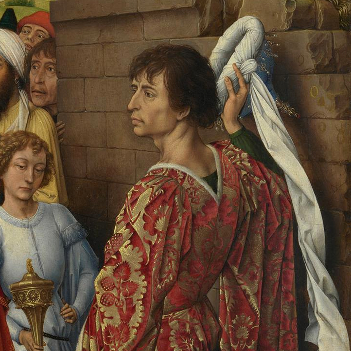 Nach Schaller handle sich beim jüngsten König, der in selbstbewusster Pose die rechte untere Bildecke dominiert, um eine Selbstdarstellung, die in ein dichtes System künstlerischer Bezüge eingebettet ist – Rogier stelle sich in Form einer Hommage an die Maler Jan van Eyck und Stefan Lochner, die ebenfalls als Porträts in den Rollen der weiteren Könige gemalt seien, an das Ende einer hierarchischen Kette.8 Allerdings sind die ikonografische Belegung als König und die Dominanz der Figur als Argumente gegen die Selbstporträtthese ins Feld zu führen. Zwar wurden ähnlich extrovertiert gestaltete, wahrscheinliche und auch belegte Selbstinszenierungen in Italien im späteren Verlauf des 15. Jahrhunderts ausgeführt (vgl. u. a. Botticellis Del-Lama-Anbetung, Ghirlandaios Vertreibung Joachims aus dem Tempel oder Signorellis Taten des Antichrist), königliche oder sonstige hochstehende Rollen wurden dabei aber selbst im Süden nicht belegt. In der Generation Rogier van der Weydens im Norden, in der sich Selbstdarstellungen durch mehr Zurückhaltung auszeichnen, sind keine derartigen Beispiele auszumachen. Auch vergleichbare Vorschläge zu Rollenporträts in Gestalt heiliger Könige, wie etwa im Fall von Herlins Königsanbetungen von 1459 und 1462, mussten mangels Beweisen zurückgewiesen werden. Zudem spricht die annähernde Profildarstellung des Königs gegen eine Selbstdarstellung Rogier van der Weydens. Handelte es sich um ein Selbstbildnis, würde diese Porträtform eine komplizierte Konstruktion mit Hilfe mehrerer Spiegel voraussetzen; ein Procedere das prinzipiell möglich, im Werk von Rogier van der Weyden aber in keinem der thematisierten Künstlerbildnisse zu erkennen ist.