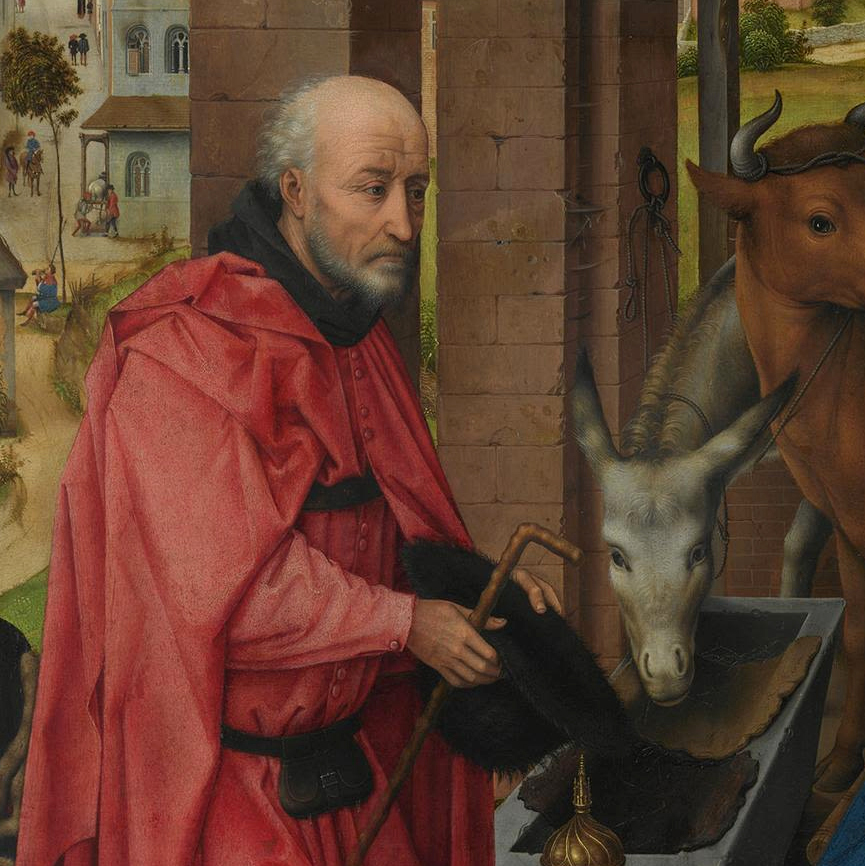 In der umfangreichen Literatur zu van der Weydens Altar finden sich zahlreiche Widersprüchlichkeiten. Neben offenen Fragen zu Basisdaten wie Auftraggeberschaft, Datierung, Provenienz und Werkstattbeteiligung4 beinhalten diese auch Überlegungen zur Identifizierung der Dargestellten. Die Heiligen Drei Könige, die traditionell als Vertreter dreier Lebensalter aufzufassen sind, werden insbesondere in der älteren Literatur in politische Zusammenhänge gestellt, was in entsprechenden, nicht verifizierbaren Deutungen resultiert: Philipp der Gute von Burgund, Ludwig XI. von Frankreich, Karl der Kühne von Burgund und Lionello d’Este von Ferrara stehen zur Auswahl.5 Ebenso verwirrend verhält es sich in Bezug auf Forschungsmeinungen zu mutmaßlichen Selbstdarstellungen des Malers. Fünf gänzlich voneinander abweichende Figuren auf unterschiedlichen Raumebenen sind als Selbstporträts vorgeschlagen: Der Mann mit weißem Bart im rundbogigen Stalldurchgang im rechten Mittelgrund; der im selben Kompartiment weiter rechts stehende Mann ohne Bart und ohne Kopfbedeckung, der sein Haupt durch den Durchblick reckt; der dritte König in der rechten vorderen Bildecke; der hl. Joseph im linken Vordergrund sowie der Stifter am äußerst linken Rand. Die Thesen zu diesen Figuren – allesamt Einzelmeinungen, die keinen Widerhall in der Forschung erfuhren – sind teils auf weitreichenden (auch ausufernden) Argumentationsketten aufgebaut. Schlagkräftige, verifizierende Momente sind nicht auszumachen. Physiognomische Rechtfertigungen, die, wie im Einleitungstext zu Rogier van der Weyden zur Genüge erörtert, nicht beweiskräftig sind, bleiben aus der nachfolgenden Argumentation ausgeschlossen. Ins Feld zu führen sind hingegen auf einer IRR-Analyse basierende gemäldetechnologische Erkenntnisse. Während festgestellt werden konnte, dass der Bereich der Figuren im Stalldurchgang intensive Bearbeitung erfuhr,6 wirft die zu differenzierende Qualität der Ausführung der Tafel Fragen auf. Nach De Vos resultiert diese aus einer großflächigen Beteiligung der Werkstatt. Lediglich die zentralen Hauptfiguren (Maria, Kind, ältester König) seien als malerische Anteile Rogiers zu werten; alle Figuren, die als Selbstdarstellungen diskutiert werden, fallen in den Verdacht, nicht autograf zu sein.7 De Vos‘ Einschätzung der Händescheidung und der gemäldetechnologische Befund wirken sich auf die Glaubwürdigkeit der Selbstporträtzuschreibungen aus: Pentimenti im Umkreis der Figuren im Stalldurchgang implizieren die Wertigkeit dieses Bereichs und die Zuwendung des Meisters, während anzunehmende Werkstattbilder wie der jüngste König, der hl. Josef und die später hinzugefügte Stifterfigur nur wenig glaubhaft als Selbstporträts festgeschrieben werden könnten. Thesen zu den zwei letztgenannten Figuren, die jeder Basis entbehren, werden nicht weiterverfolgt.
