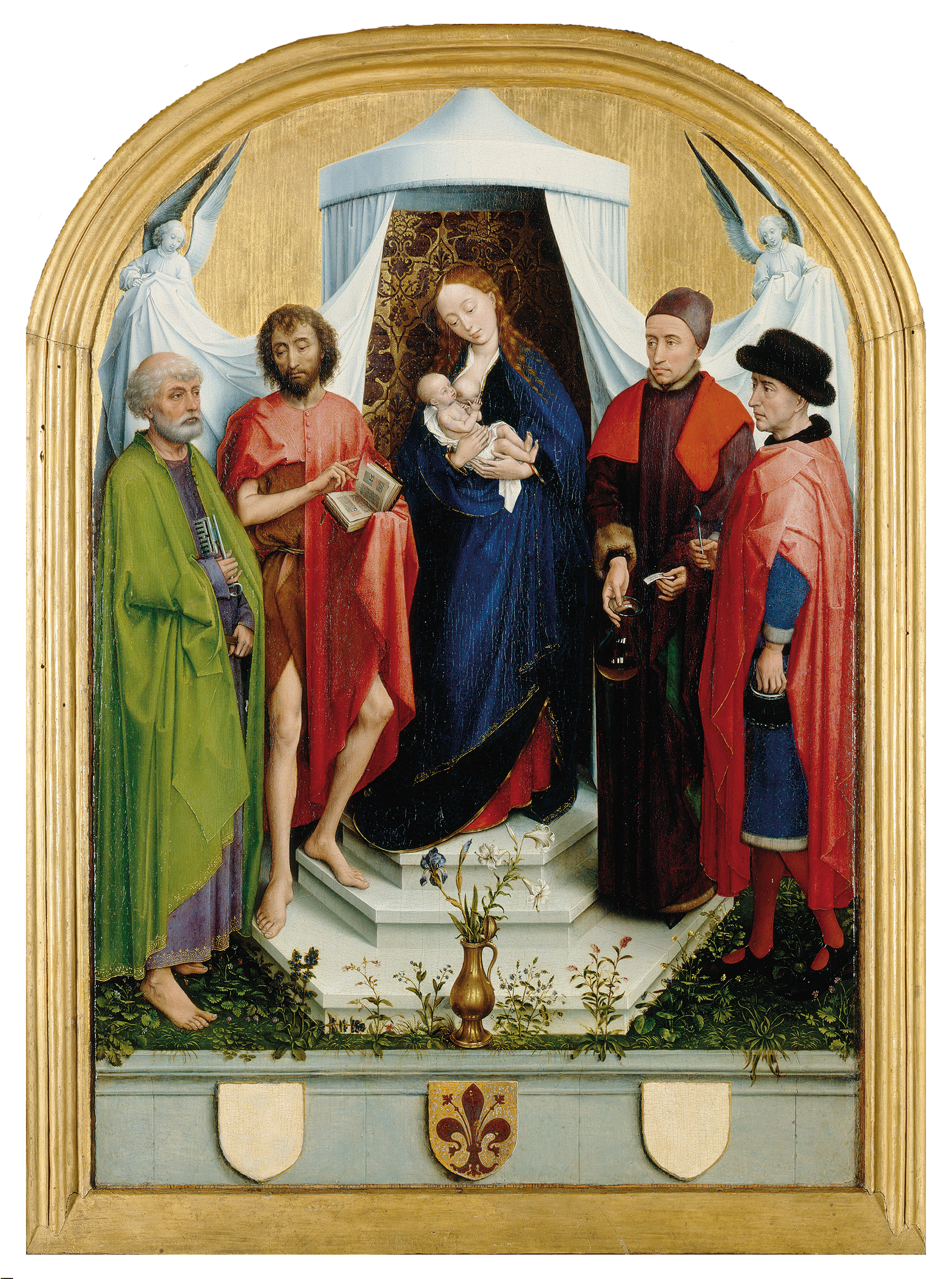 Die Porträthaftigkeit der hll. Ärzte Cosmas und Damian in der nach italienischem Modell als sacra conversazione1 ausgeführten Medici-Madonna von Rogier van der Weyden gibt der Forschung seit geraumer Zeit Anlass, Spekulationen über die Identität der Dargestellten anzustellen. Als Schutzpatrone der Medicis werden die Heiligen teils als Porträts verschiedener Mitglieder der Patrizierfamilie angesehen.2 Sowohl diese als auch andere Identifizierungen sind wenig überzeugend,3 konkrete Angaben zu den dargestellten Männern können nicht gemacht werden.