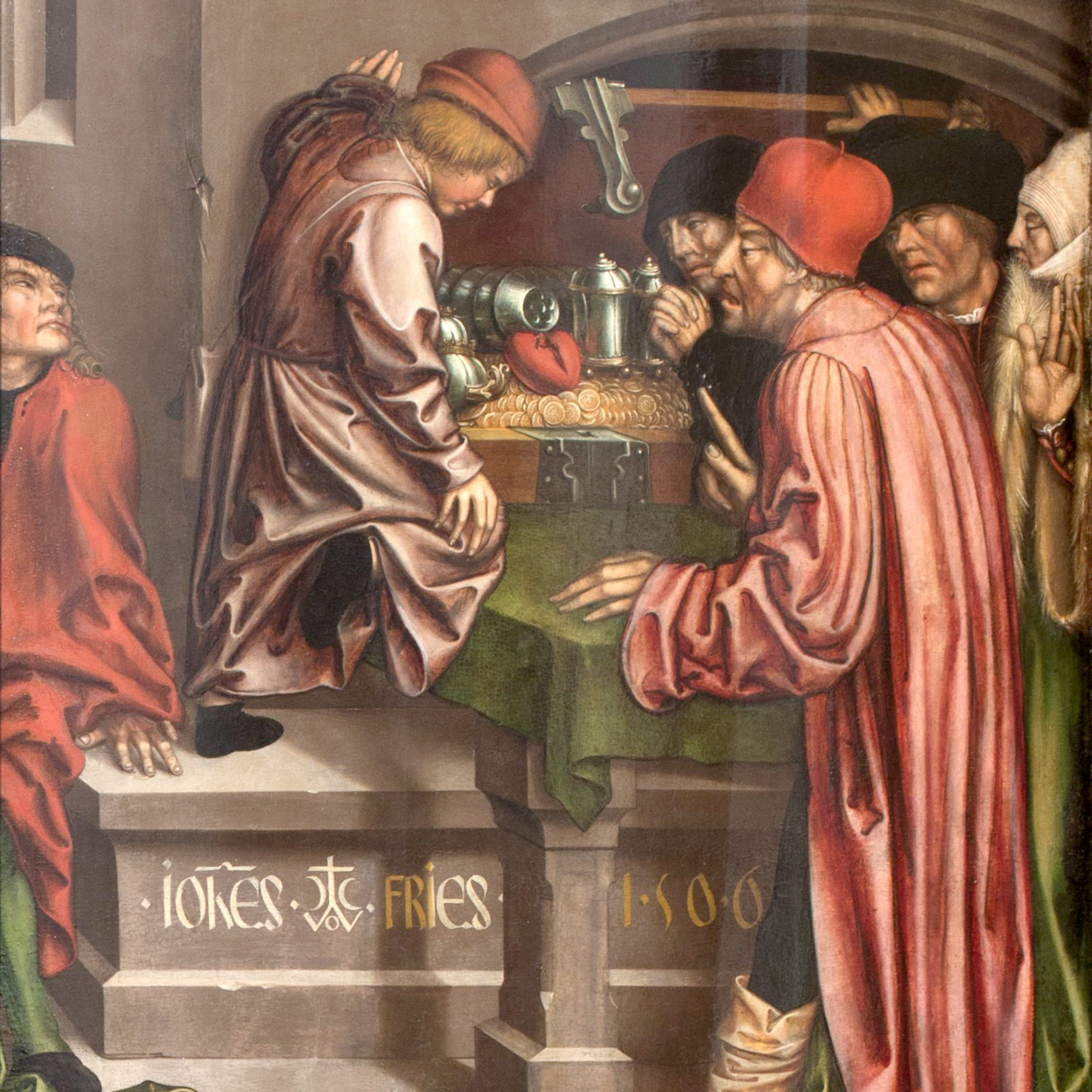 Besonders hervorzuheben ist jedoch das zweiteilige Gemälde Predigt des hl. Antonius von Padua (1506),6 das nach Schallers Interpretation Fries in zwei oder möglicherweise sogar drei Altersstufen zeigt. Auf der rechten Tafel dieses Werks identifiziert Schaller zwei Bildnisse, die Fries darstellen könnten: den Mann ganz links, der den Einstieg in die Szene markiert, sowie den alten Mann ganz rechts, der mit einer Geste des Abschieds die Komposition abschließt. Zwischen diesen beiden Figuren entfaltet sich die Handlung, in deren Zentrum ein Knabe die höchste Position im Bild einnimmt. Dieser Knabe, so Schaller, könnte Fries in seiner Jugend darstellen. Die blonde Haarfarbe und die rote Kappe, die möglicherweise auf seine zukünftige Tätigkeit als Maler verweist, stützten diese Annahme.