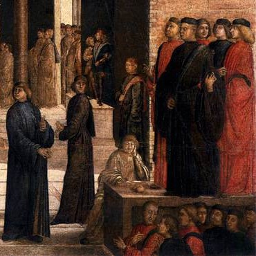 Lazzaro Bastiani gehört zusammen mit Künstlern wie Gentile und Giovanni Bellini, Mansueti oder Carpaccio der zweiten Generation venezianischer Maler an, die in der Tradition der venezianischen istoria stehen und die sich durch den von Fortini-Brown so bezeichneten „eyewitness style“ auszeichnen.1 Als „Augenzeugen“ schildern sie eine scheinbare Momentaufnahme der istoria: Ihre Darstellungen sind deskriptiv und detailtreu, bedacht auf Authentizität und Glaubhaftigkeit des historischen Ereignisses. Gemeinsam ist den genannten Künstlern zudem eine allgemeine narrative Grundhaltung, die sich vor allem in formalen Strategien in ihren Werken kundtut. Wie unten genauer erläutert, betrifft diese die Komposition, das Setting sowie die Positionierung der Figuren.