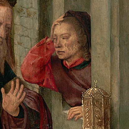 Das erste dieser Bildnisse sei in der Berliner Anbetung der Könige (um 1485)3 zu finden, wo ein junger Mann mit markanten Zügen durch das Stallfenster blickt. Ein weiteres erscheine in der Madrider Kreuzigung Christi (um 1487),4 in der es in der Figur des Evangelisten Johannes erste Alterserscheinungen aufweise. Ein drittes Bildnis finde sich in der Kreuztragung im Bowes Museum (um 1495).5 Hier sei ein ähnlicher Mann zwischen den Kreuzarmen dargestellt, mit eingefallenen Wangen und Augen, der – wie im Berliner Gemälde – die Kopfbedeckung abnimmt und wie ein Kommentar zum Leiden Christi wirke. Ein weiteres Mal erscheine der Mann in der Liverpooler Grablegung Christi (1486/87),6 diesmal als Profilansicht mit schweren Augen. Das letzte Bildnis sei in der Grablegung Christi (um 1490)7 in St. Louis zu finden, wo der Mann, nun stark gealtert und entspannt, dargestellt sei.