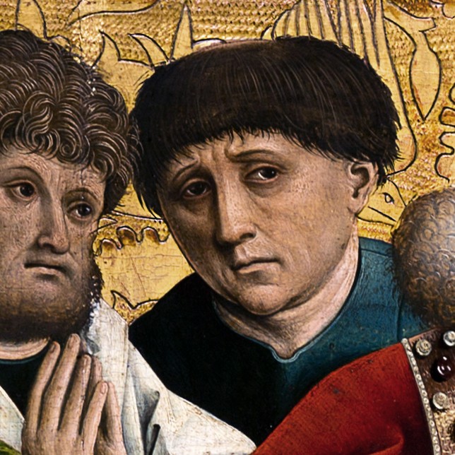 Folgt man den Ausführungen von Robert West, so gestaltet der Meister vermehrt Bildnisse, die sich vom Geschehen abheben. So erinnere ein junger Mann vorne links im Pfingstwunder, der ganz in weiß gekleidet ist, an ein integriertes Selbstporträt.7 West gibt an, dass der Gedanke naheliege, dass sich der Meister aus Interesse an der eigenen Erscheinung häufig selbst darstellte. Eine Wiederholung des Porträtkopfes sei in einem Gemälde zum Hl. Wolfgang in München gegeben – auf dieses habe ihn Stiassny aufmerksam gemacht.8 Auch Stiassny bemerkt die Ähnlichkeit des autonom dargestellten Hl. Wolfgang zum jungen Mann im Pfingstwunder, allerdings ohne von einer Selbstdarstellung zu sprechen.9 Eine weitere vergleichbare Figur sei in der Tafel Jesus im Tempel10 des Retabels von Großgmain dargestellt.11