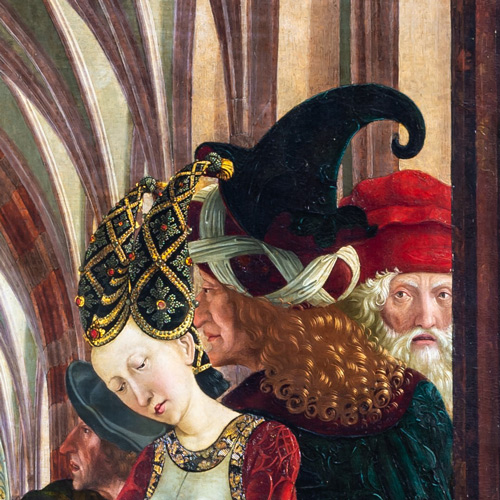 Die meisten AutorInnen argumentieren in Hinblick auf mutmaßliche Selbstbildnisse Pachers auf Grundlage physiognomischer Ähnlichkeiten, zudem fließen allgemeine Überlegungen zu zeitaktuellen Darstellungsmodi des Sujets ein. Keines der vorgeschlagenen Selbstporträts ist eindeutig belegbar, dennoch verdienen die Thesen weitere Beschäftigung – insbesondere da Pachers Wirken unmittelbar mit Andrea Mantegna verbunden ist, der seinerseits zahlreiche Selbstinszenierungen hinterlassen hat. Mit Pachers Aufenthalt in Padua in den 1460er-Jahren waren ihm intensive Studien der Werke Mantegnas (neben anderen namhaften Renaissance-Meistern), v. a. hinsichtlich der Auseinandersetzung mit den neuen Möglichkeiten der Perspektive und Bildkonzeptionen, möglich. Dies sollte Pachers Schaffen nachhaltig prägen – was sich nicht zuletzt im Altar von St. Wolfgang zeigt.3 Mantegnas Vorbildfunktion könnte durchaus auch Pachers Auseinandersetzung mit dem Selbstporträt angeregt haben – zumindest müssen Pacher Mantegnas Selbstbildnisse ebenso bekannt gewesen sein, wie auch die prinzipiellen Entwicklungen des Motivs in der Zeit.4 In Pachers Werk überlagern sich südliche und nördliche Einflüsse, u. a. sind Berührungen mit der Kunst Rogier van der Weydens gegeben.5 Dessen frühes integriertes Selbstporträt, das heute nur in Form einer Tapisseriekopie6 erhalten ist, wurde von Cusanus, der in Brixen in unmittelbarer Nähe zu Pachers Werkstatt wirkte, in seiner Schrift De visione dei thematisiert.7